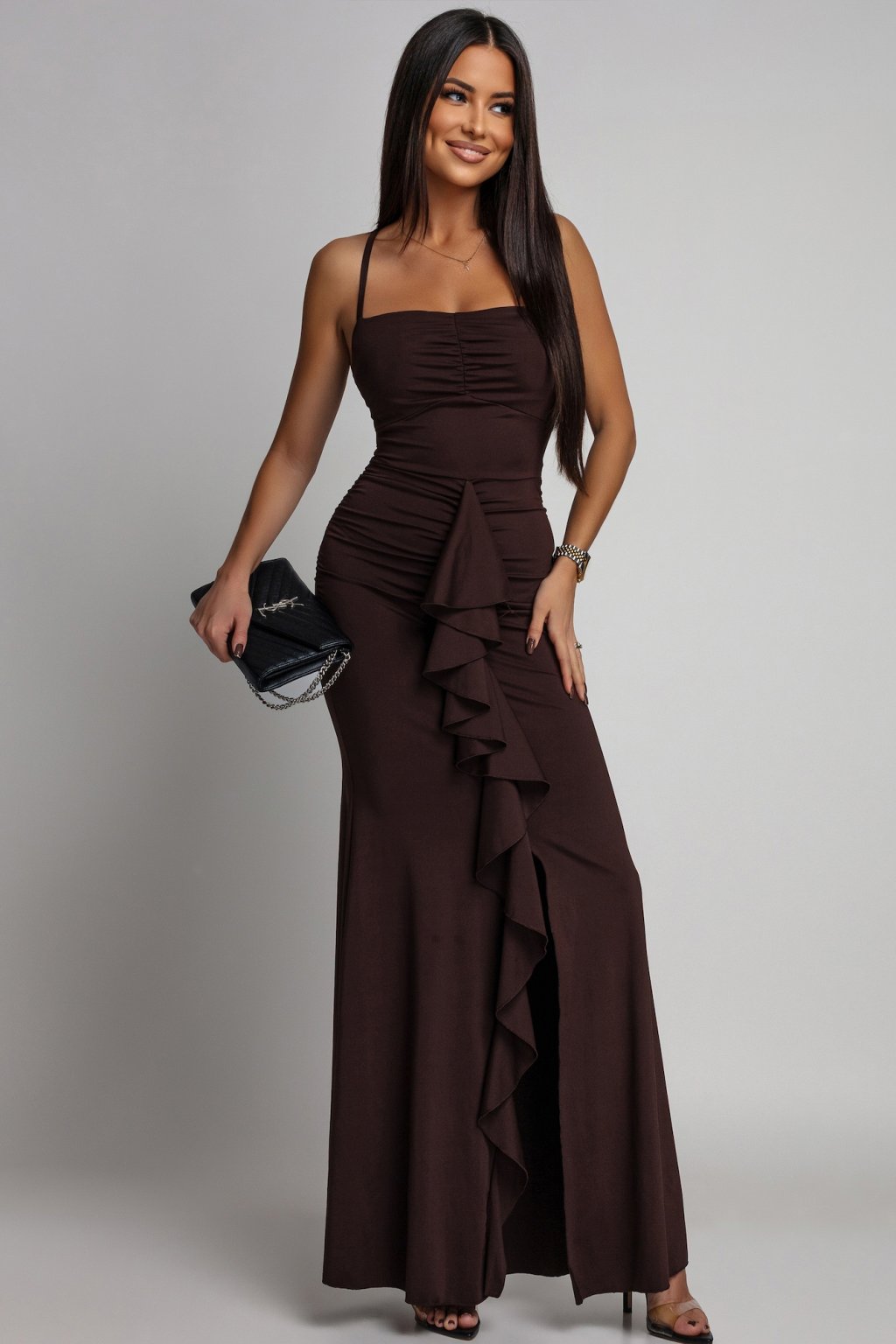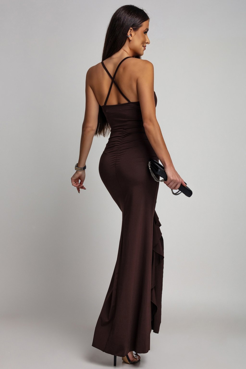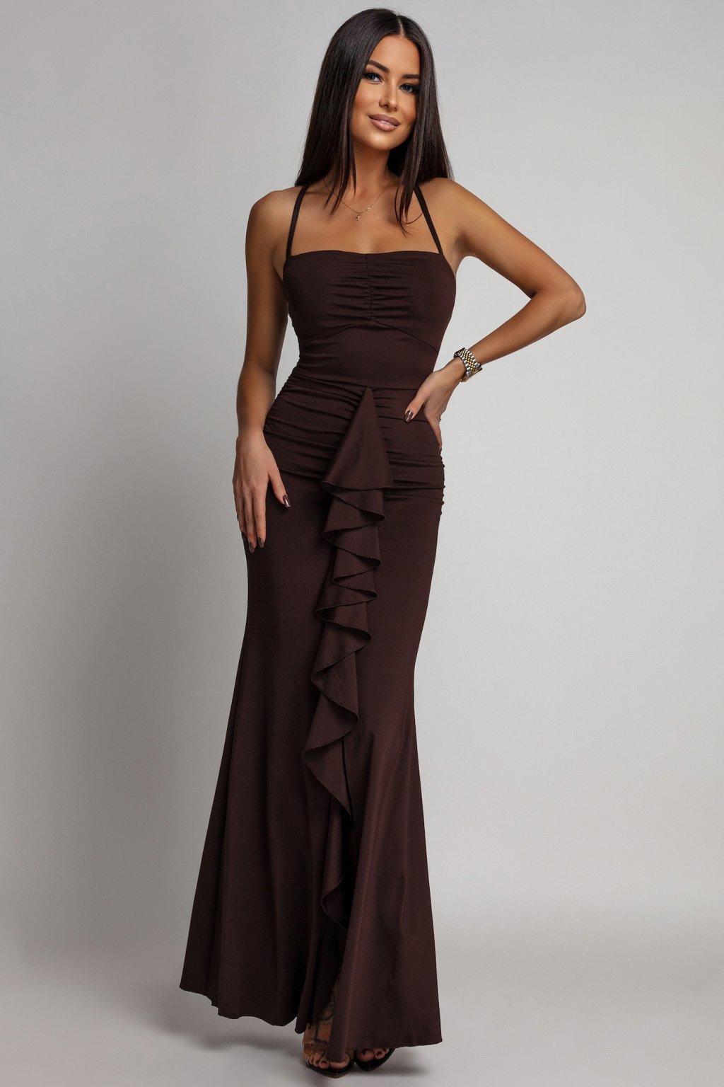 Barna testhezálló ruha fodrokkal