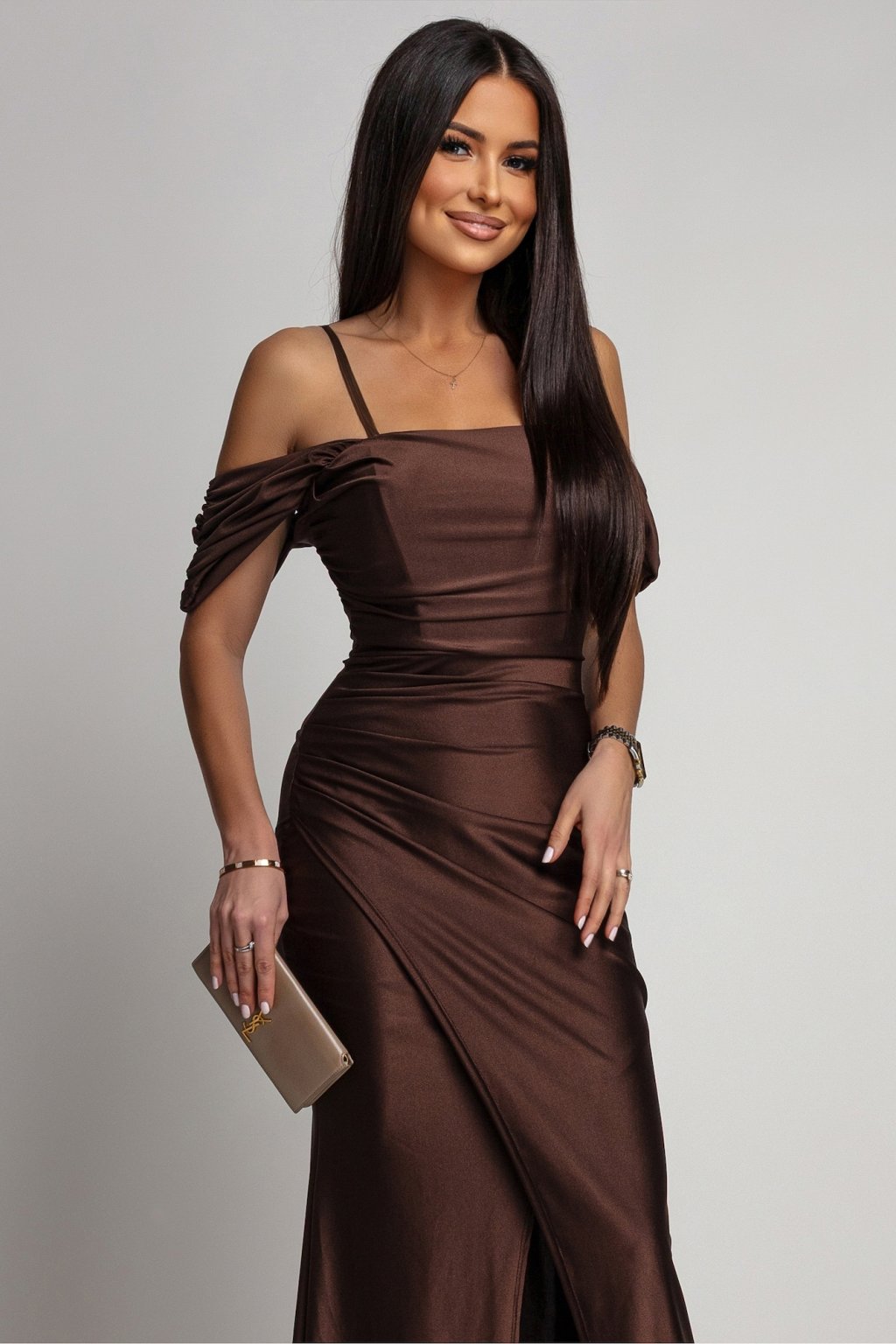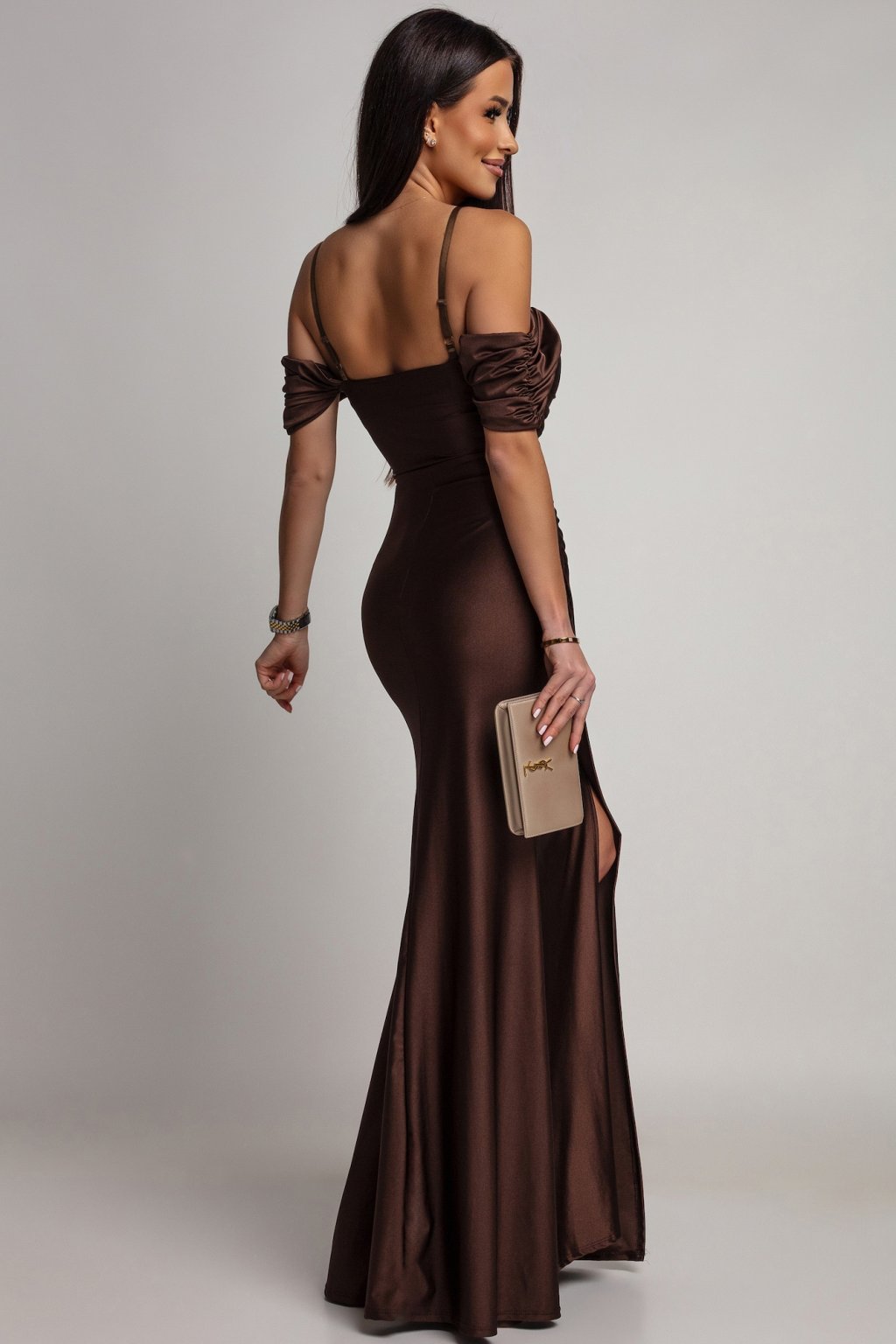 Barna testhezálló ruha hasítékkal