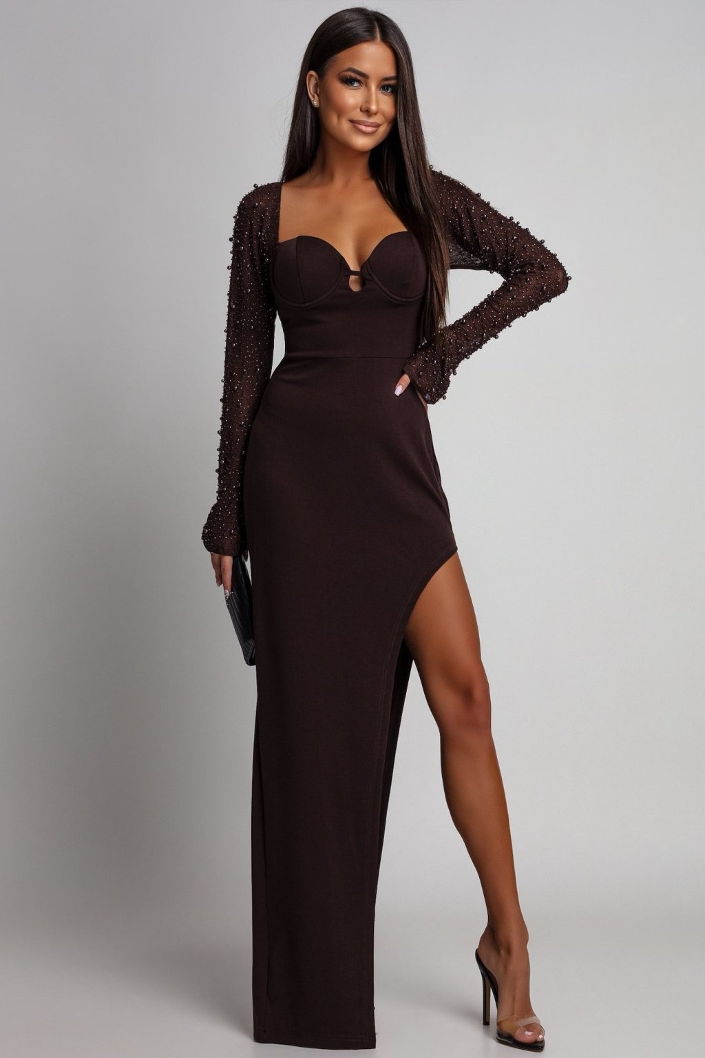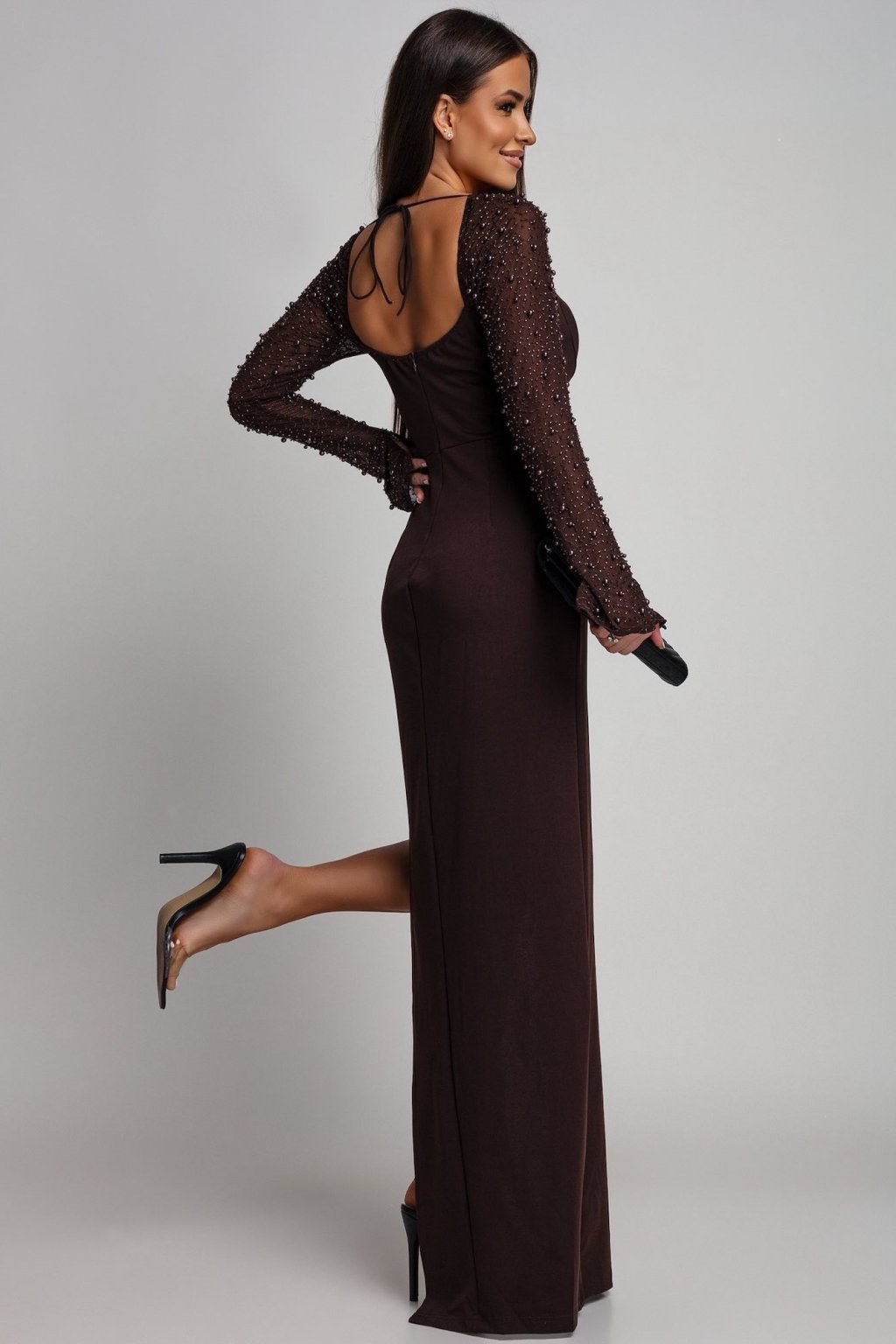 Barna testhezálló ruha magas hasítékkal