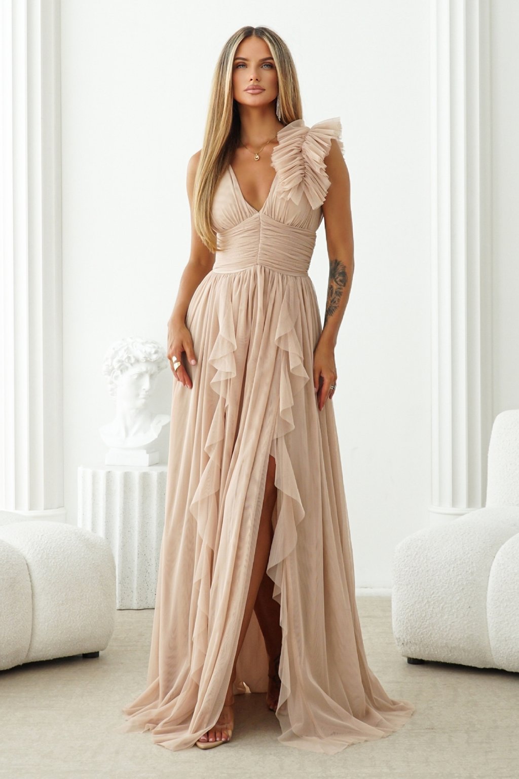 Ebben a ruhában biztosan nem marad észrevétlen. A vállat díszítő tüll fodrok és a tüllel borított hasíték, amely kiemeli minden lépését, előkelő, pompás és érzéki megjelenést biztosít. A ruha mellrészén megerősített, hátul cipzárral záródik.