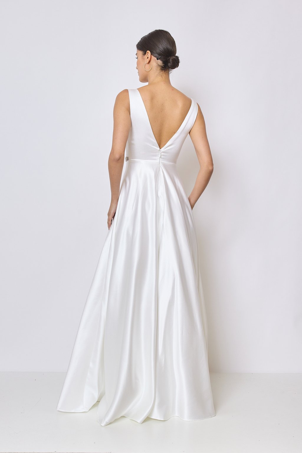 Gyönyörű alkalmi ruha, amely pompát és eleganciát sugároz magából. Az ezüst díszítés biztosítja a bájos megjelenést, és garantáltan királynő lesz az oltár előtt. A ruha mellrészén megerősített, hátul cipzárral záródik.