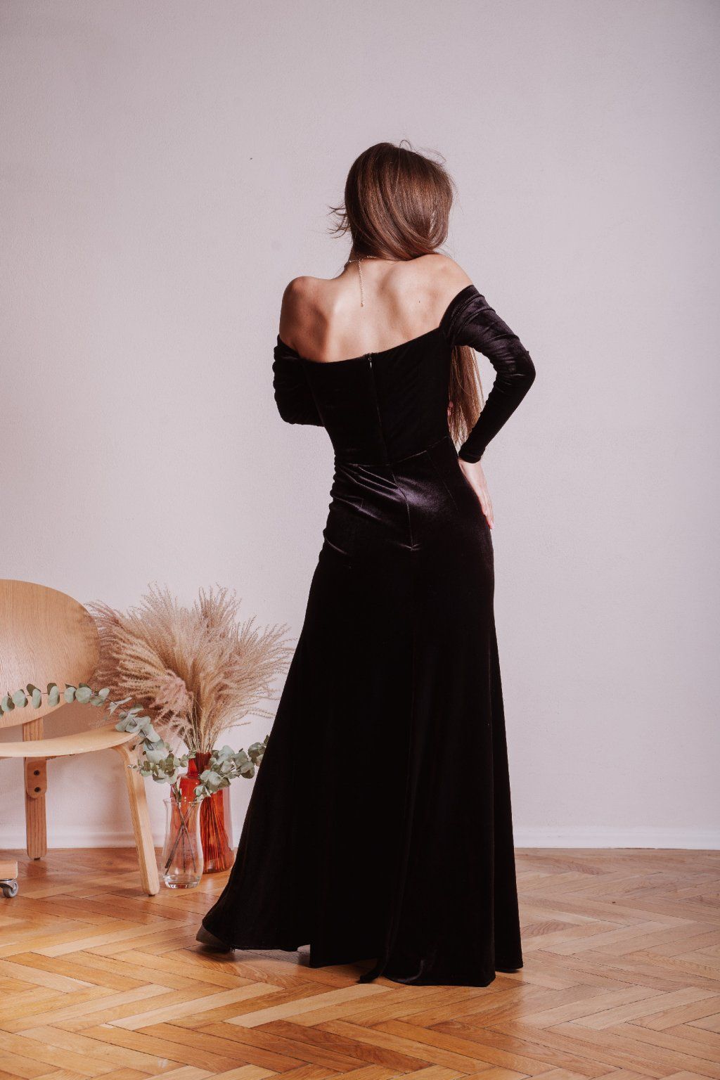 Ha egy ruhát tökéletesnek nevezhetünk, akkor ez a ruha mindenképpen megérdemli ezt a címet. Elegáns bársony anyag, rafináltan nyitott vállak, és a sexi magas hasíték - felejthetetlen kombináció. Garantáltan királynő lesz benne a táncparketten. A ruha anyaga enyhén rugalmas, hátul cipzárral záródik.
