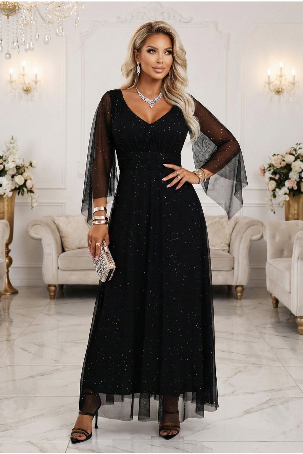 Egy luxus darab, amely különleges alkalmakra van tervezve. A ruha nemes és kifinomult megjelenést kölcsönöz szolíd csillogásának és precíz kidolgozásának köszönhetően. A laza ujjak és az elegáns sziluett tökéletes harmóniát teremtenek a kényelem és az exkluzív megjelenés között. Tökéletes választás bálokra, gálaestekre vagy ünnepi eseményekre. A ruha anyaga rugalmas, a mellrészén pedig megerősített.