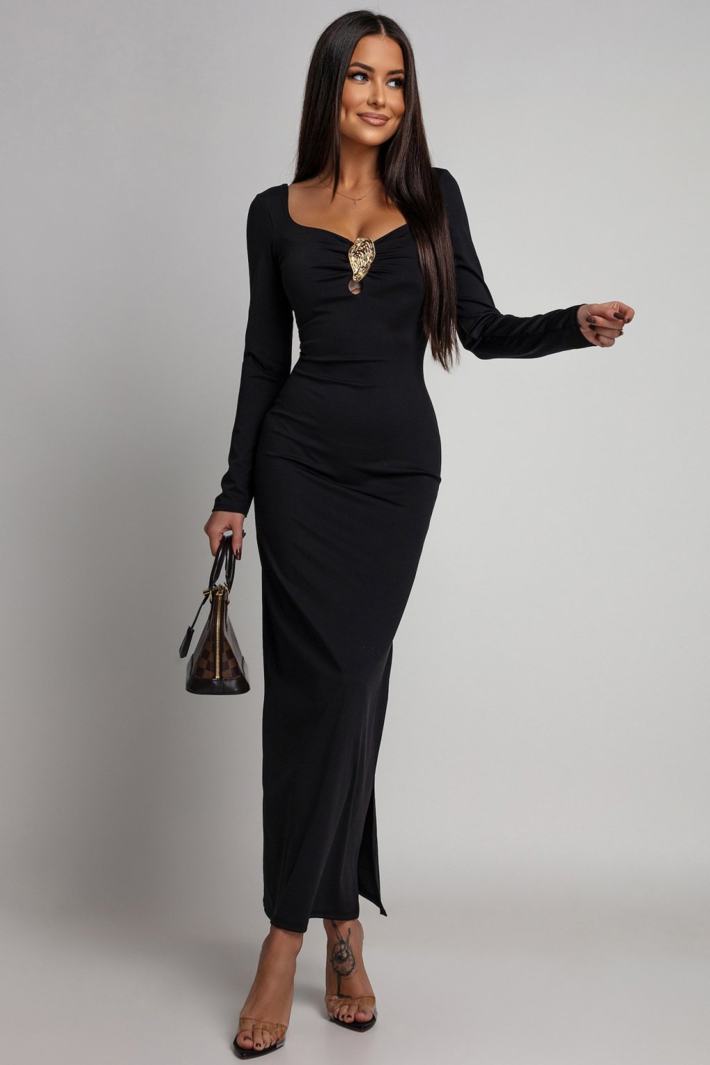 Az időtálló szabás, a ruha elején elhelyezett arany applikációval gazdagítva, kifinomult és elegáns megjelenést biztosít. A ruha hatása könnyed, mégis nagyon ízléses - tökéletes választás a visszafogott eleganciát kedvelő hölgyek számára. A ruha anyaga rugalmas, a mellrészén pedig párnázott.