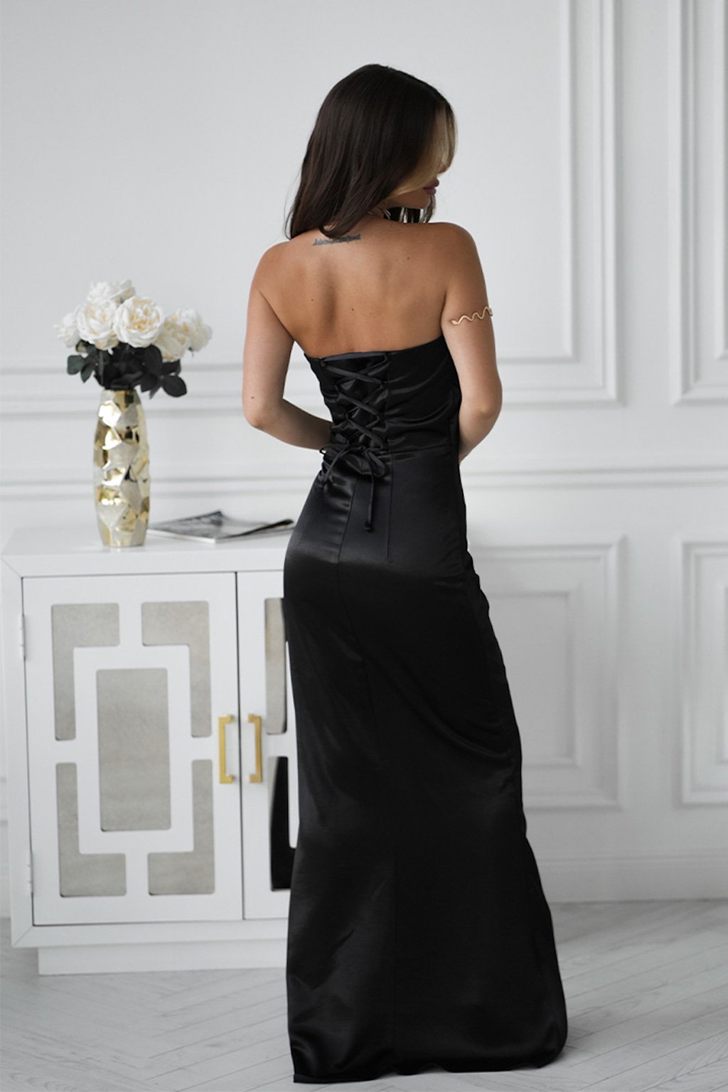 Egy ruha, amely a szenvedély és az elegancia nyelvén szól hozzánk. A szatén anyag gyengéden öleli körül a sziluettet, és egy frissen nyílt virágszál benyomását kelti. A felsőrész kidolgozása egy teljes pompájában virágzó rózsára emlékeztet - a nőiesség, a szépség és a gyengédség szimbóluma. Ideális választás minden alkalomra,  ahol ragyogni szeretnél és megjelenéseddel felejthetetlen benyomást kelteni. Oldalán cipzárral záródik.