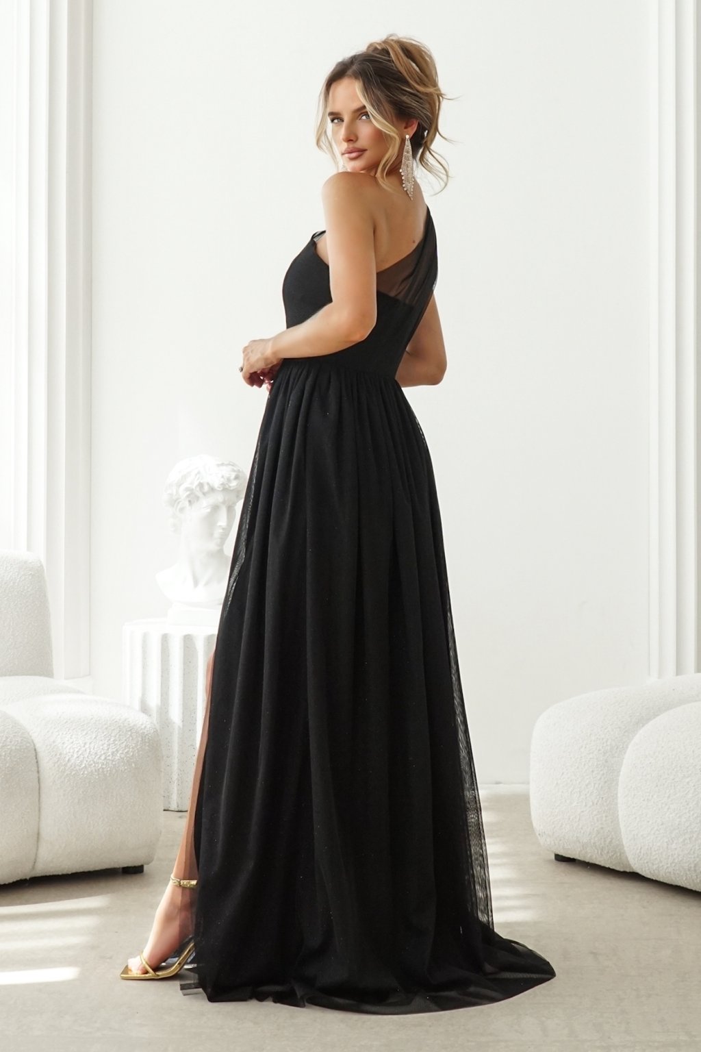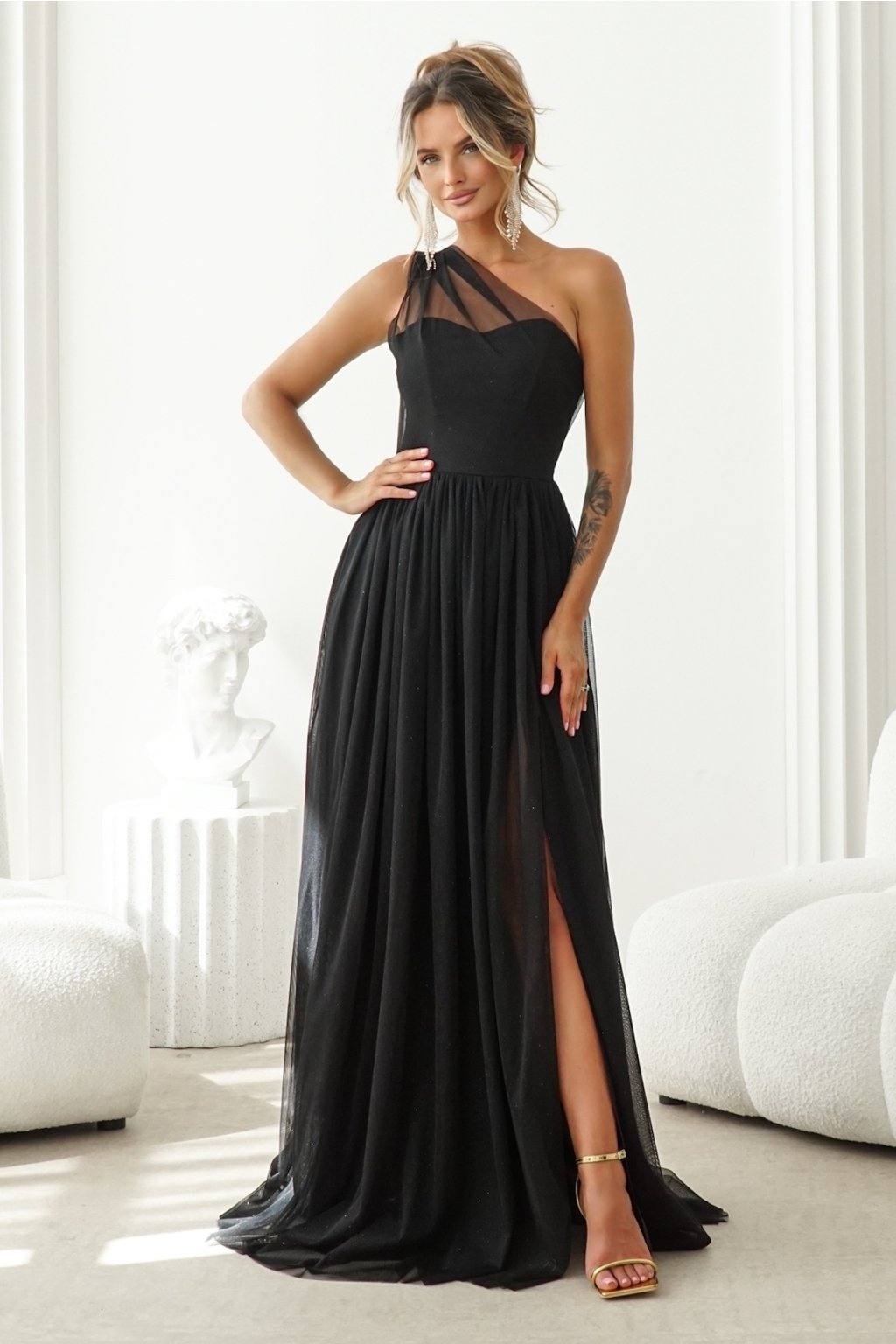 Ez a darab éteri eleganciájával és nőies bájával tűnik ki. Az aszimmetrikus szabás félvállas felsőrésszel modern megjelenést kölcsönöz a ruhának, a laza esésű szoknya ravasz hasítékkal pedig könnyű és romantikus hatást kelt. Ideális választás különleges eseményekre, ahol kecsességgel és kifinomultsággal szeretne tündökölni. A ruha oldalán cipzárral záródik.
