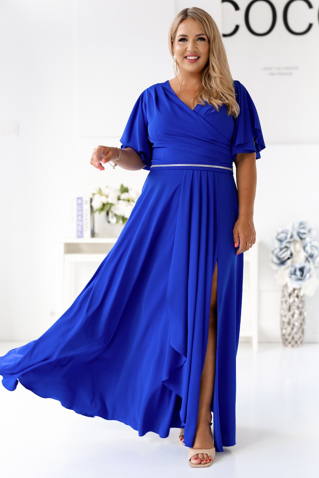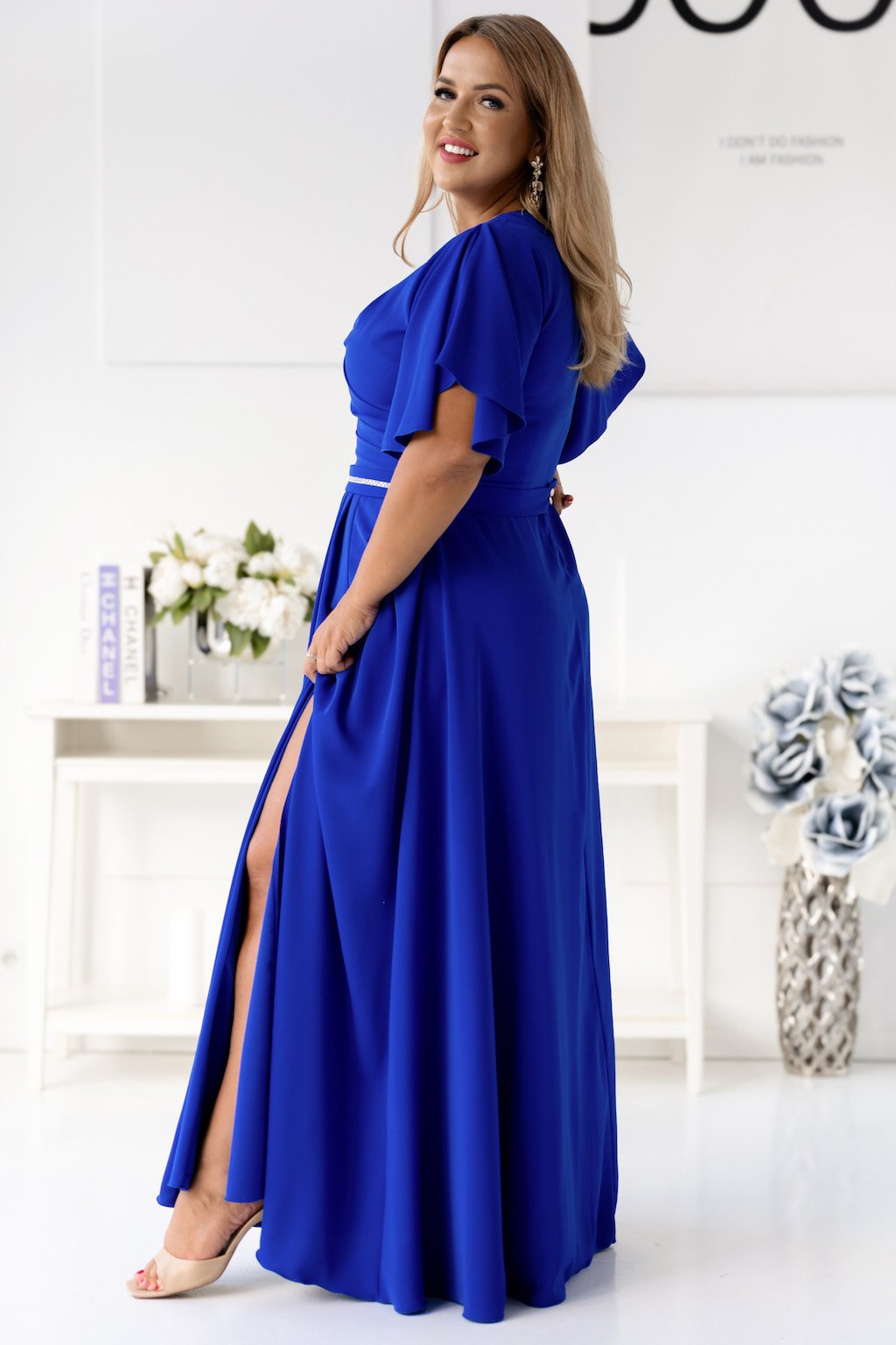 Ez a hosszú ruha kifinomultságot és nőiességet áraszt. A laza, szellős ujjak a kényelem érzését kölcsönzik a megjelenésnek, a derekán található csillogó öv pedig gyönyörűen kiemeli a nőies sziluettet egy csipetnyi luxussal kiegészítve. A ruhát úgy tervezték, hogy viselője kényelmesen és egyben fenségesen érezze magát. A magas hasíték csábító hatást kölcsönöz a ruhának. Tánc közben pedig biztosítja a kecses és elegáns mozdulatokat. Ideális választás bármilyen társasági eseményre, ahol nemességgel és bájjal szeretne tündökölni.