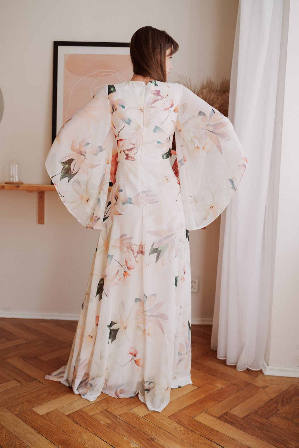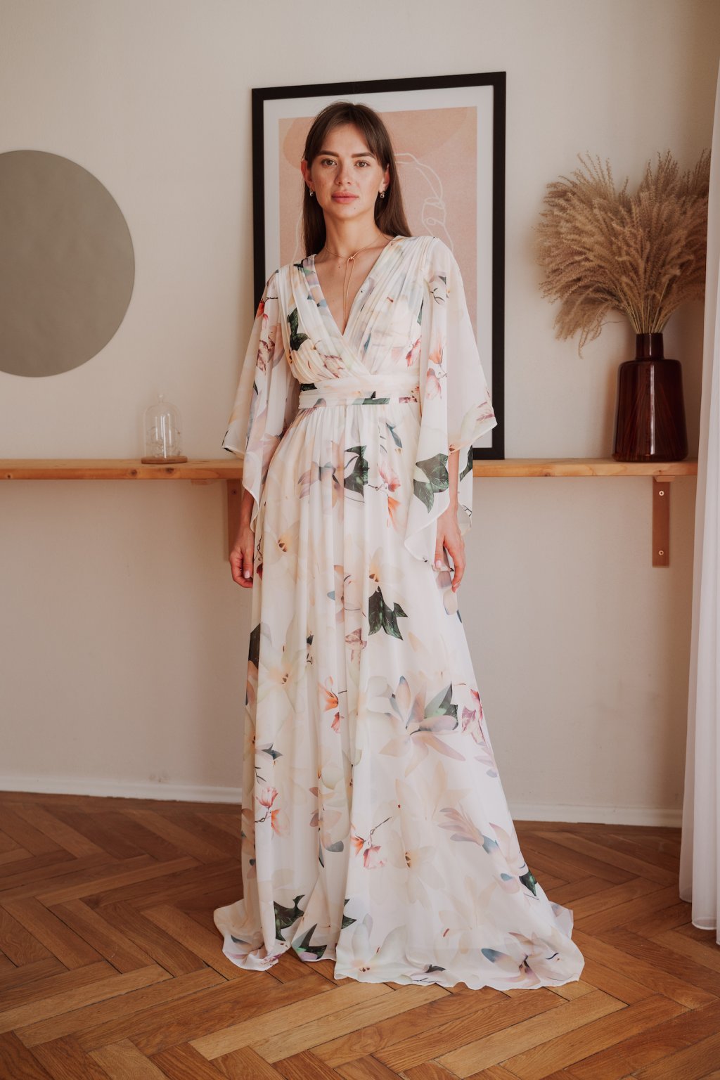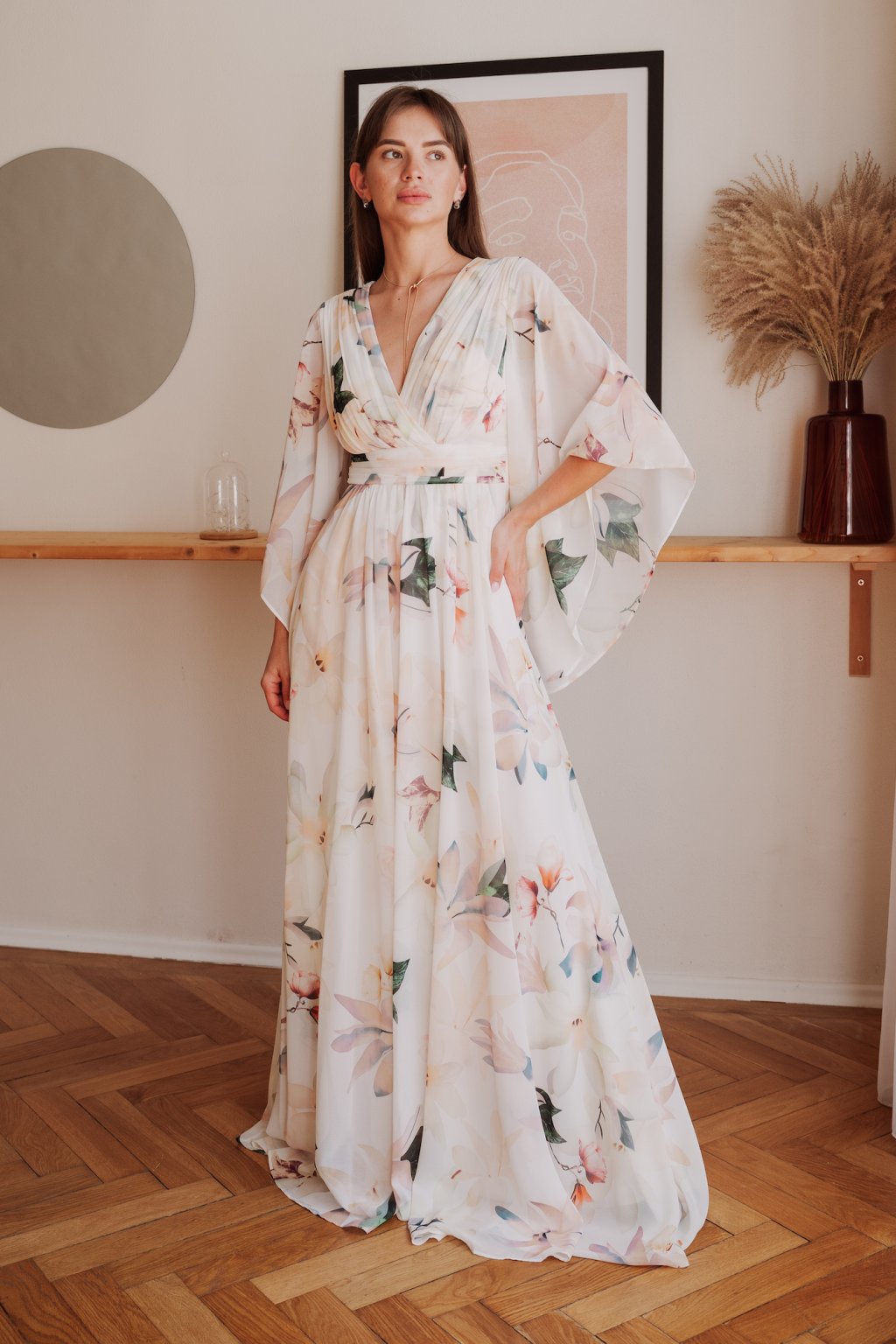 Könnyű anyag, romantikus virágok - tökéletes darab egy nyári esküvőhöz, egy nem hagyományos ruhában.