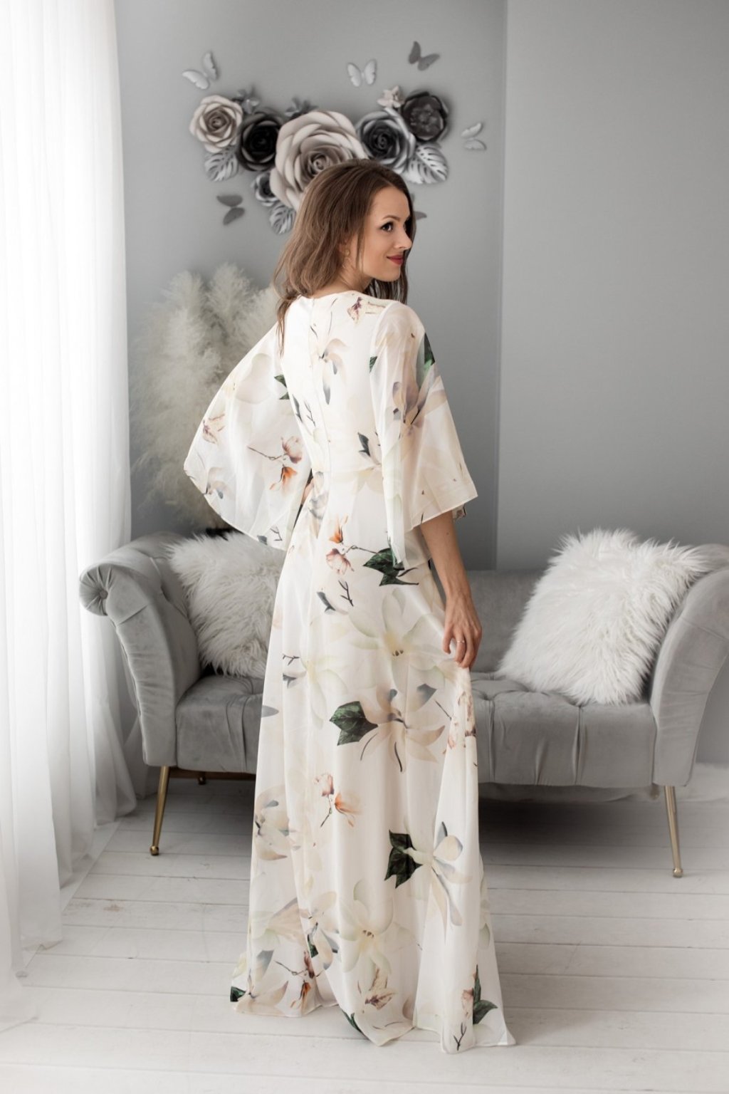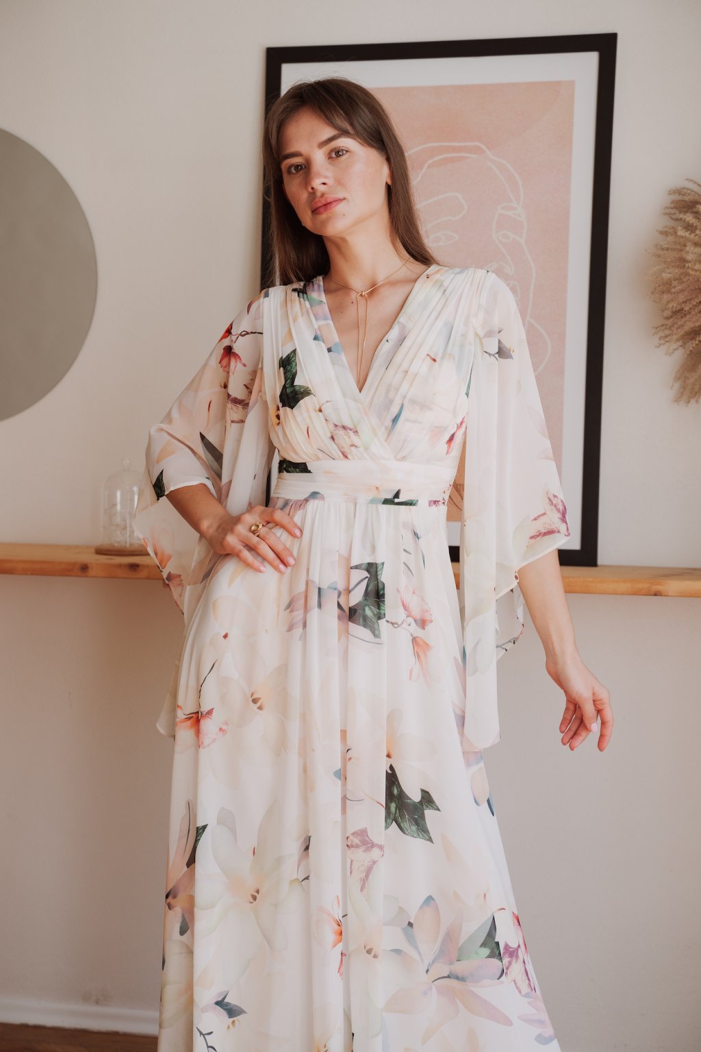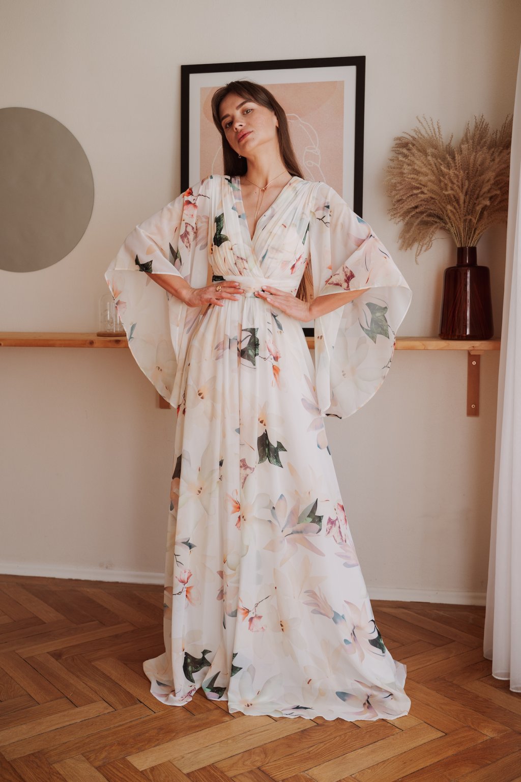 Könnyű anyag, romantikus virágok - tökéletes darab egy nyári esküvőhöz, egy nem hagyományos ruhában.