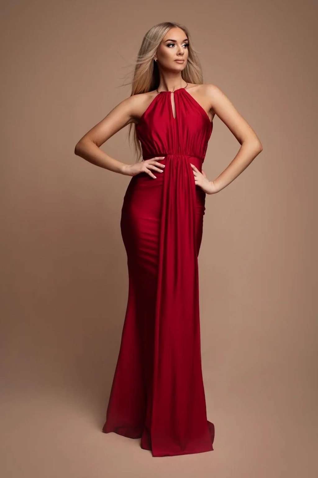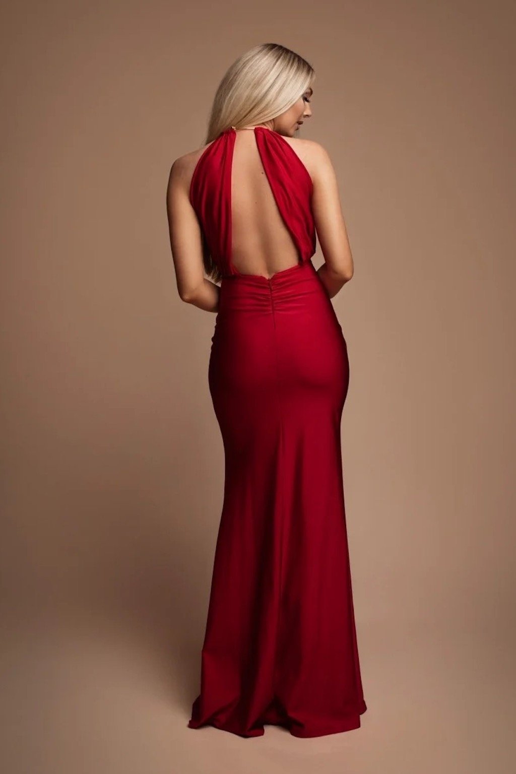 Egy gyönyörű alkalmi ruha, amely a pompa és az elegancia érzését hagyja maga után. A nyakat szegélyező fémkarika teszi szokatlanná a ruhát. Anyaga elasztikus, hátul cipzárral záródik, mellrészén megerősített.