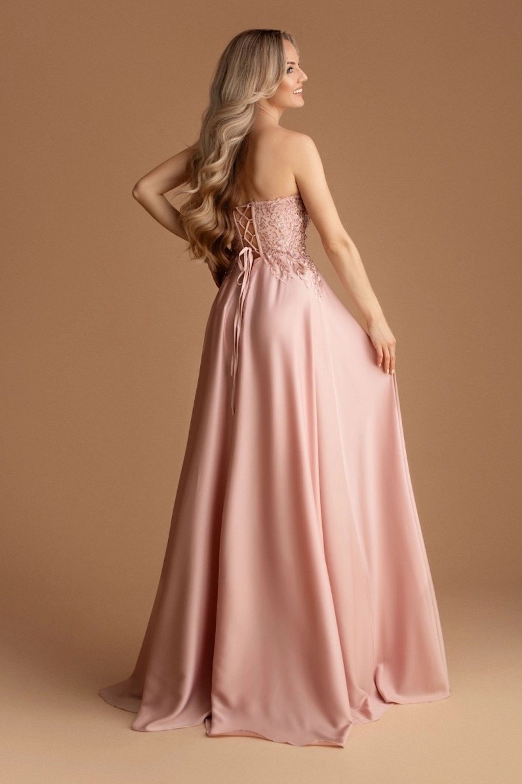 A feltűnő fűző decens csipkével díszítve elegánsan formázza az alakot. A könnyű, szatén anyagból készült szoknya minden lépésnél kecsesen mozog, a magas hasíték pedig érzékiséget és eleganciát kölcsönöz a modellnek. Ideális választás bálba, gálaestre vagy különleges társasági eseményekre. A ruha mellrészén megerősített, és levehető pántokkal rendelkezik.