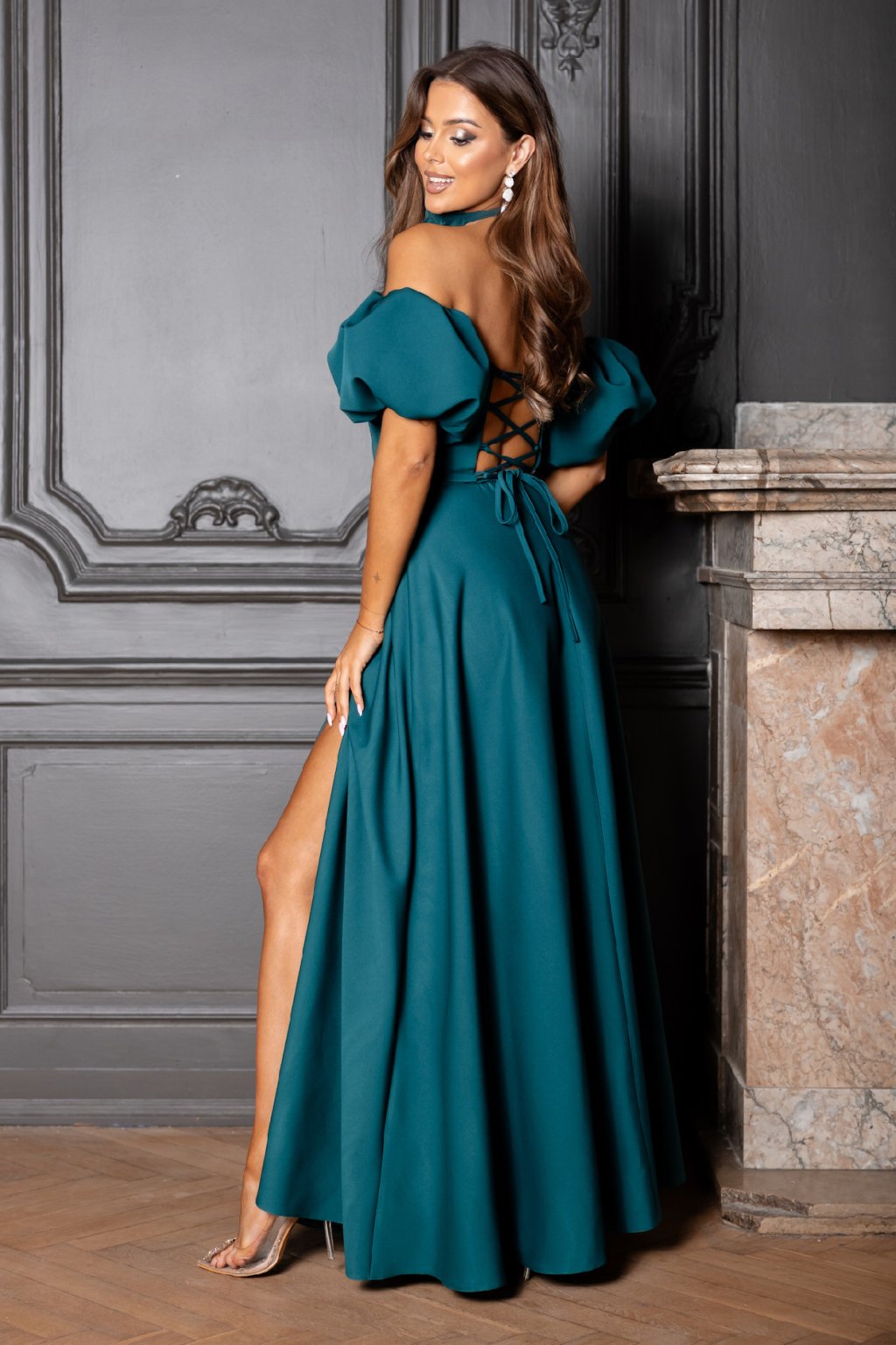 Merülj el a mesevilágban, és éld át a varázslatos pillanatokat ebben az elbűvölő, romantikus ruhában. A fűző stílusú felsőrész elegánsan kiemeli a dekoltázst, miközben a szellős szoknya szelíd hasítékkal kiegészítve kecsességet és érzékiséget kölcsönöz a megjelenésnek. A lenyűgöző ballonujjak finoman ötvözik a drámaiságot és a nőiességet, különleges karaktert adva a ruhának. Ideális ünnepélyes rendezvényekre, bálokra, esküvőkre vagy gála estekre - ebben a ruhában minden esemény felejthetetlen sztárja leszel.