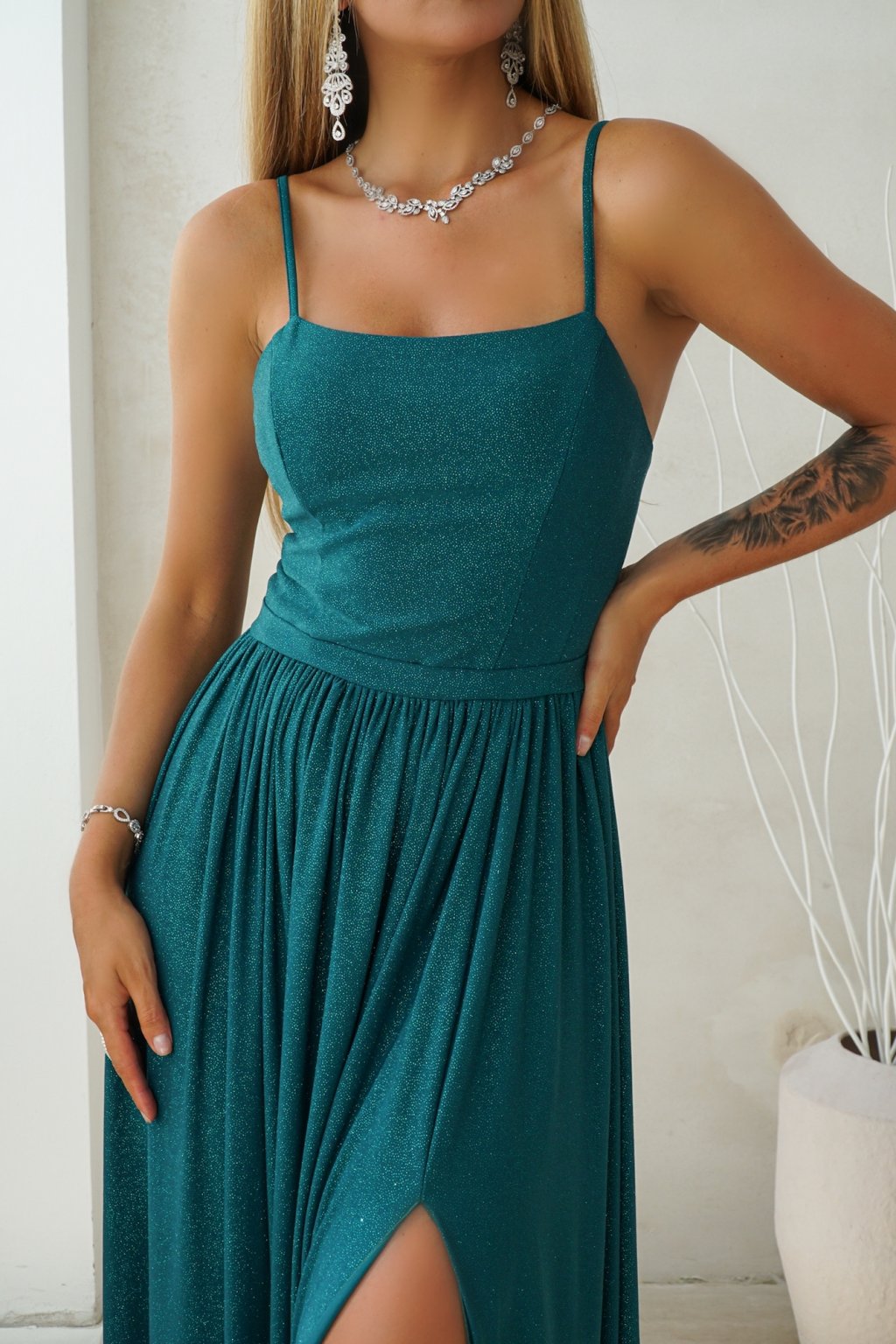 Smaragdzöld csillogó ruha hasítékkal