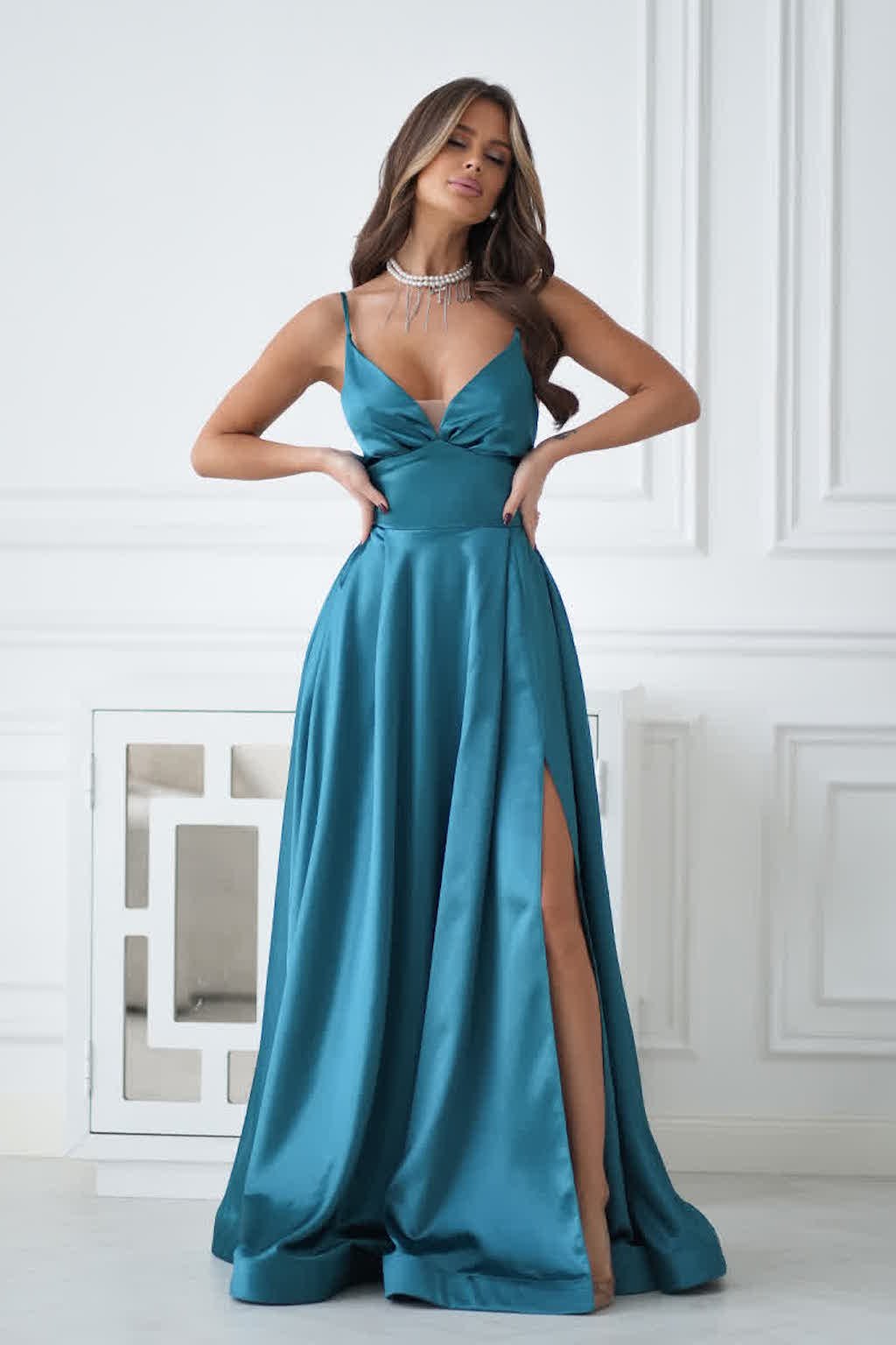 Smaragdzöld szatén ruha hasítékkal