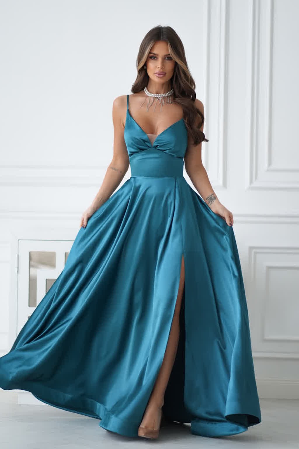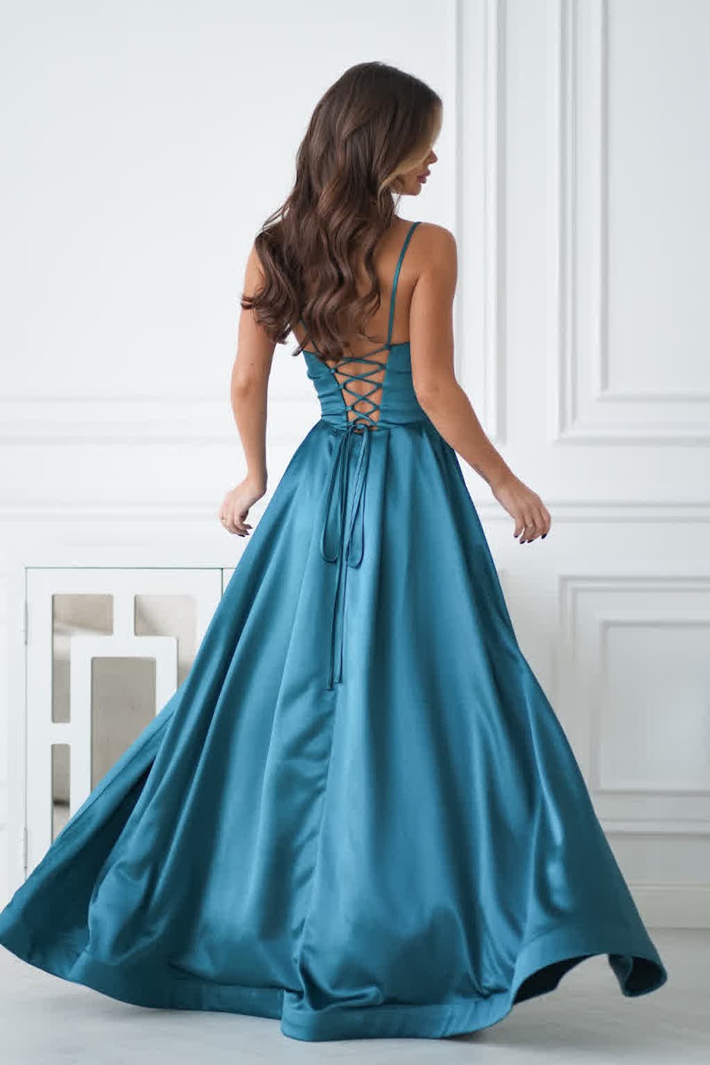 Ez az estélyi ruha a kifinomultság és az érzéki vonzerő tökéletes összhangja. A ruha minden részletét úgy tervezték, hogy viselőjének igazán kivételes megjelenést biztosítson– legyen szó akár társasági eseményről, gálaestről, vagy olyan pillanatokról, amikor igazán exkluzív stílusban szeretne ragyogni. A ruha a szoknyán cipzárral záródik, a hátoldalán pedig fűzős, melynek köszönhetően a vállpántok hosszát kényelmesen lehet állítani.