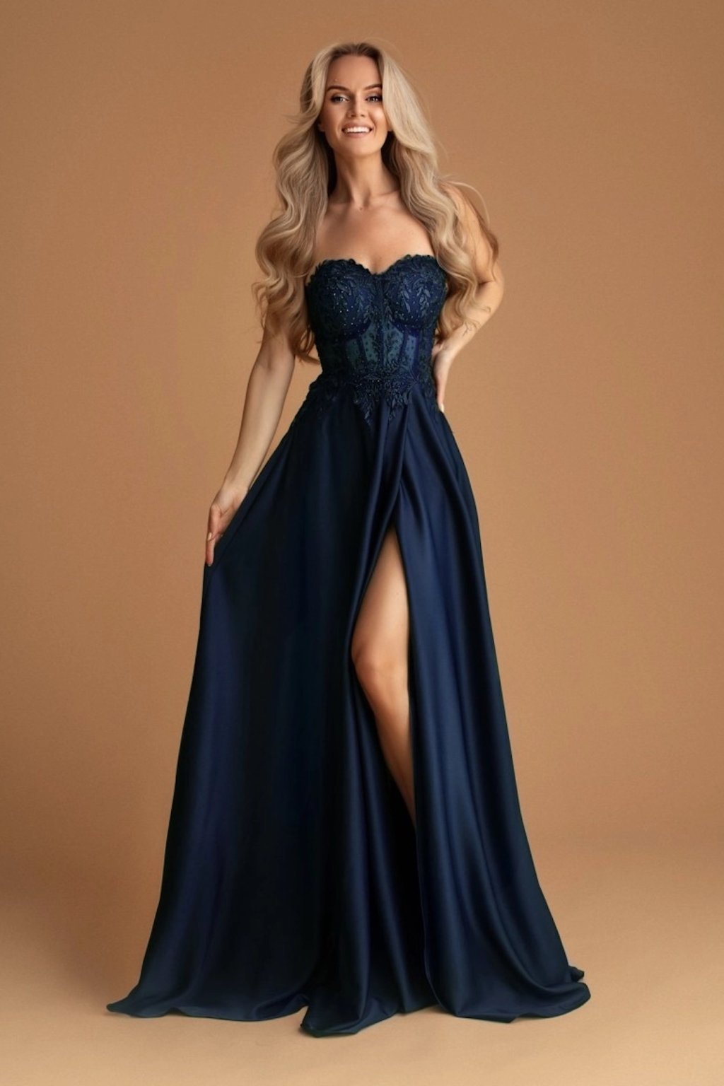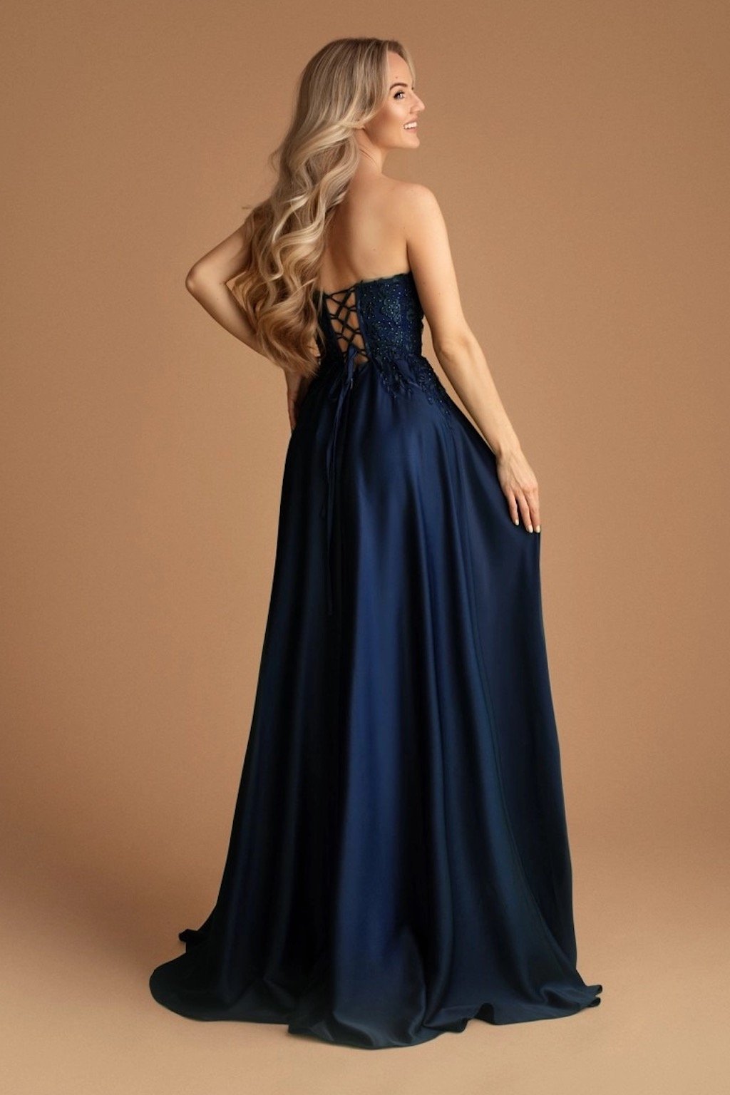 A feltűnő fűző decens csipkével díszítve elegánsan formázza az alakot. A könnyű, szatén anyagból készült szoknya minden lépésnél kecsesen mozog, a magas hasíték pedig érzékiséget és eleganciát kölcsönöz a modellnek. Ideális választás bálba, gálaestre vagy különleges társasági eseményekre. A ruha mellrészén megerősített, és levehető pántokkal rendelkezik.