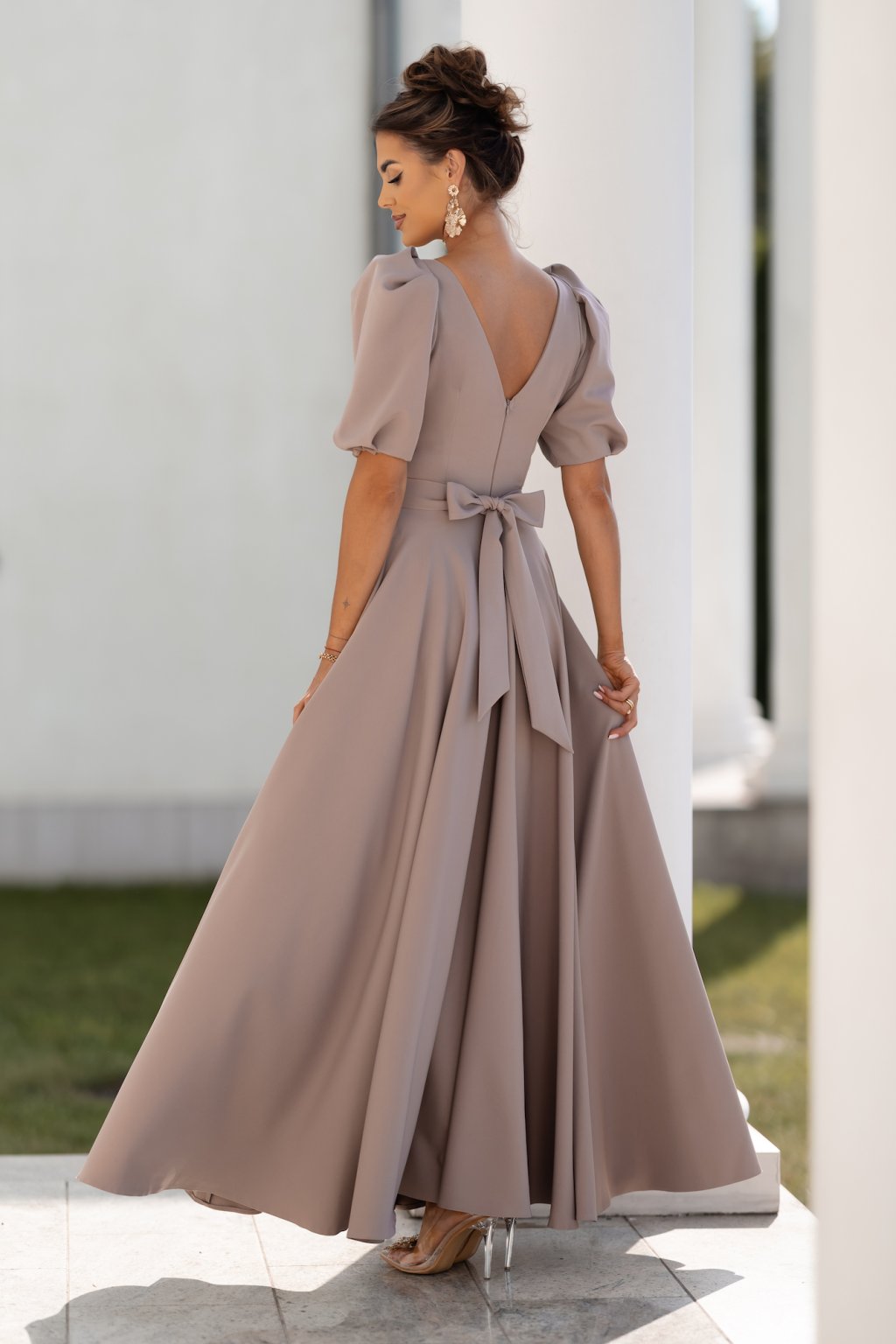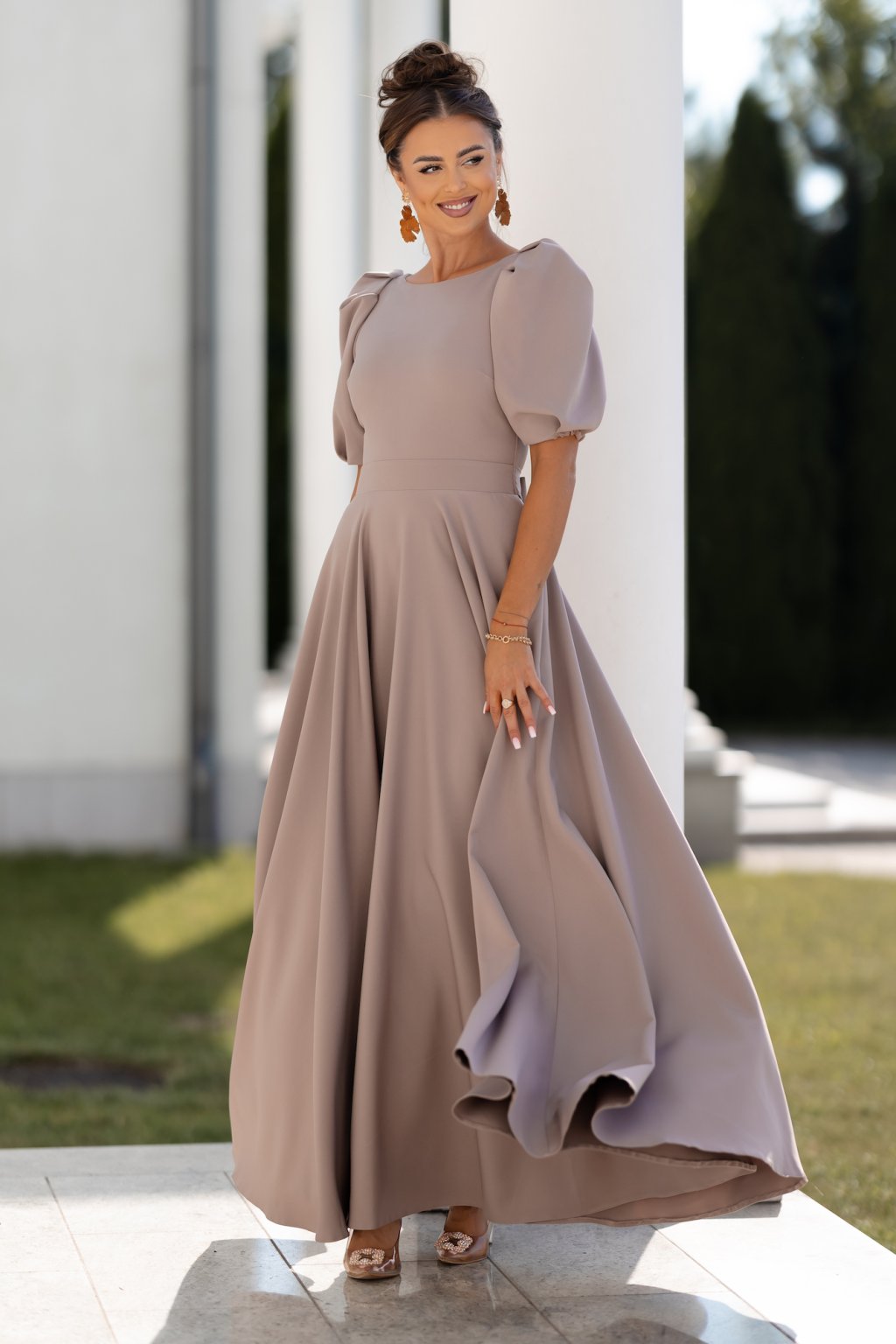 Világosbarna alkalmi ruha ballon ujjakkal