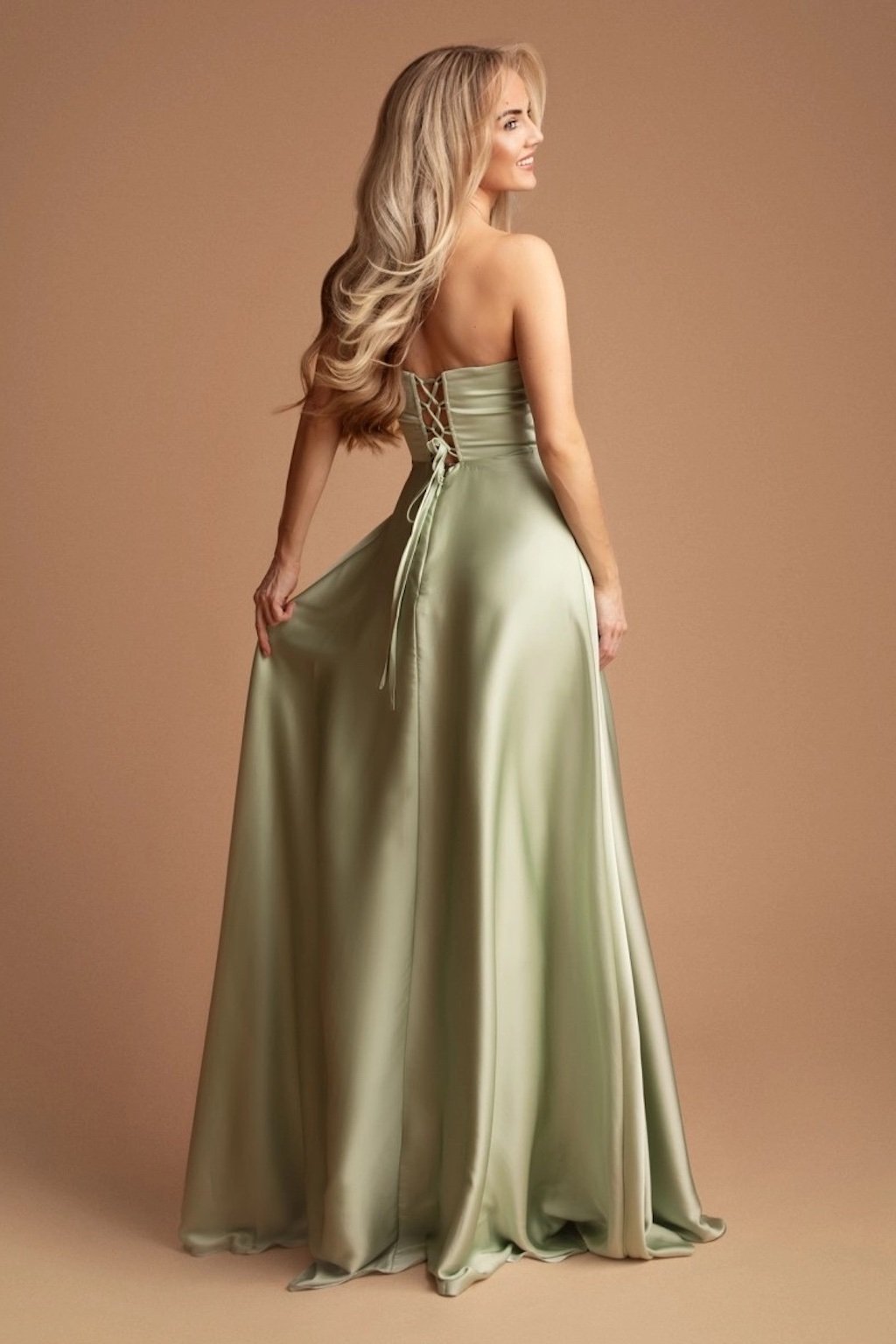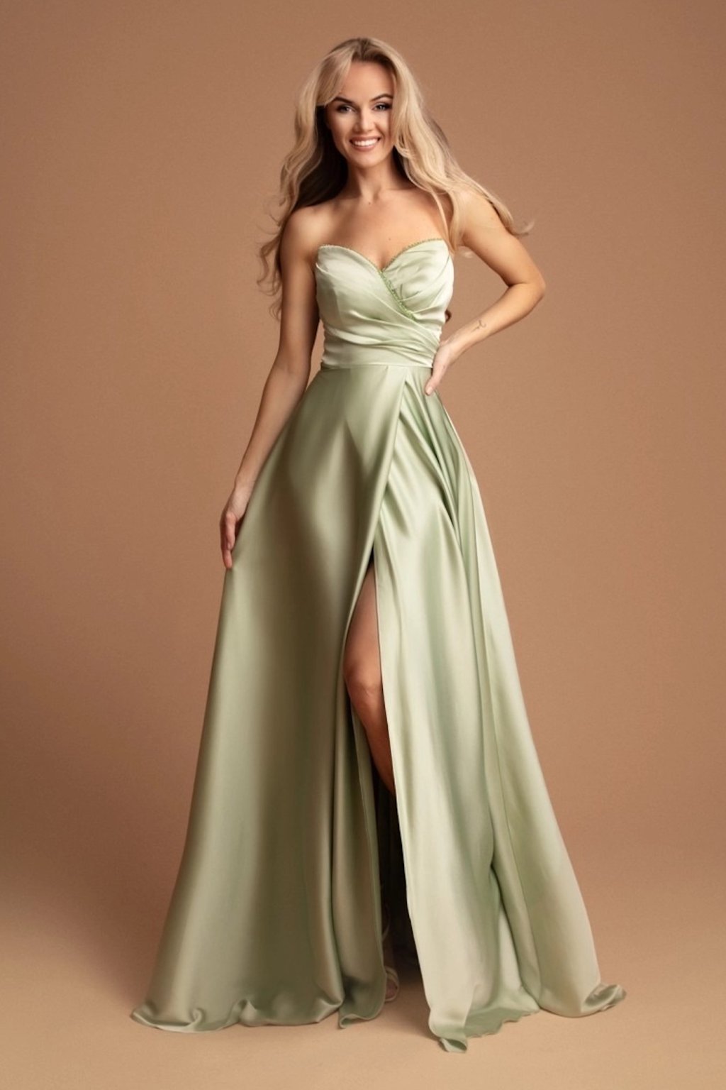 A szatén garantálja a magával ragadó megjelenést, nagy adag eleganciával és stílusossággal kiegészítve. Ez alól ez a szatén ruha sem kivétel. A tökéletes megjelenéshez hozzájárulnak a dekoltázst díszítő szolid strasszok és a hasíték. A ruha mellrészén megerősített, hátul fűzős, a szoknyán cipzárral záródik. A vállpántok szükség szerint eltávolíthatóak.