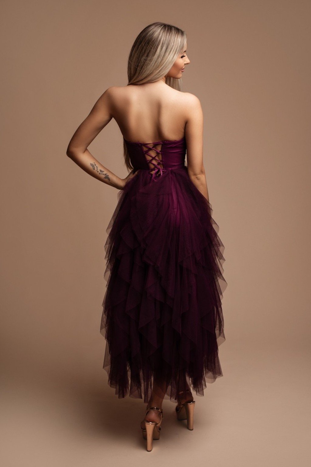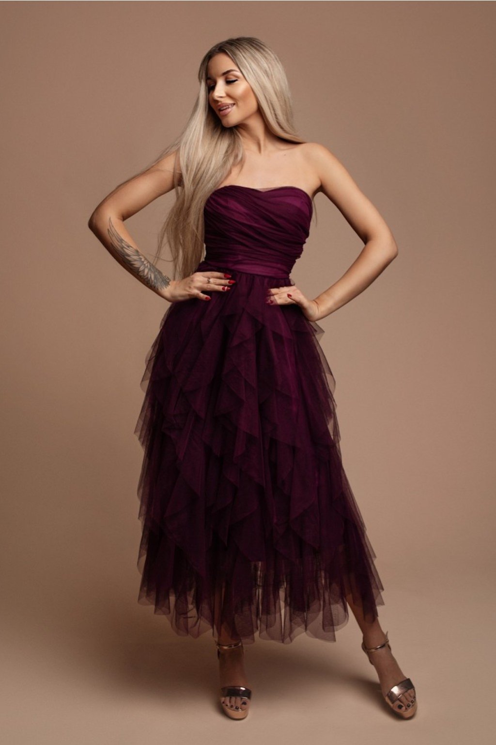 Bíborszínű midi ruha fodros tüllel