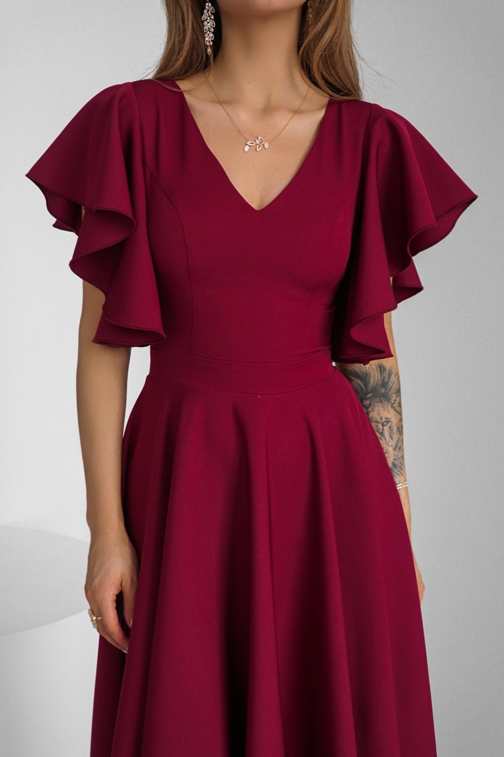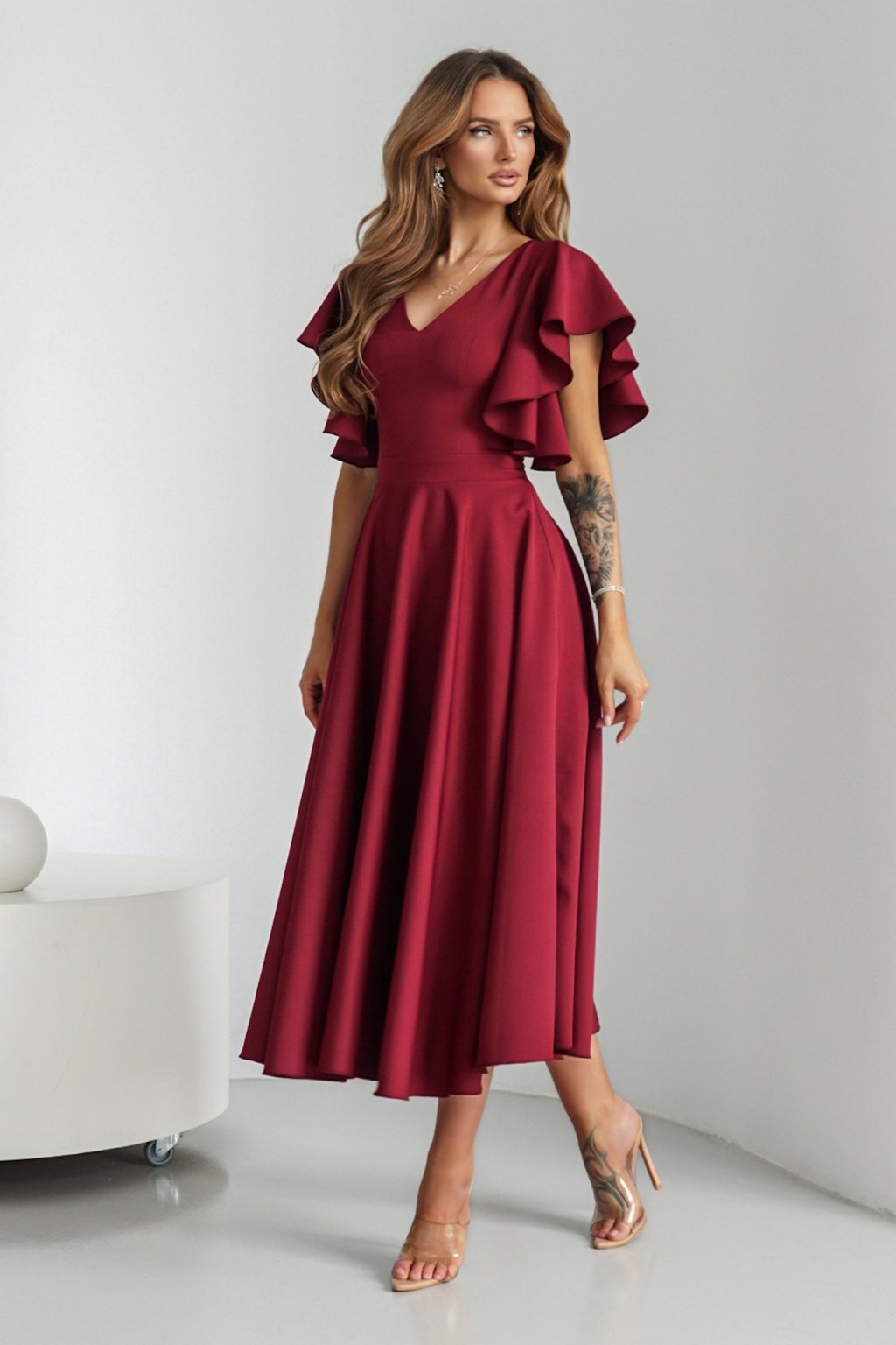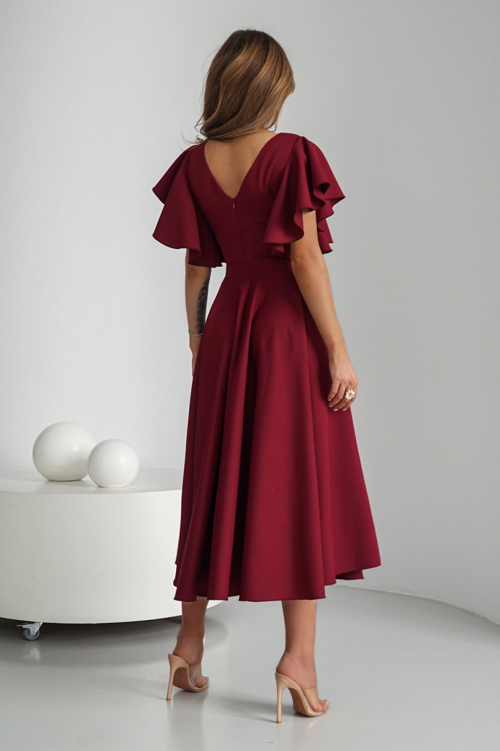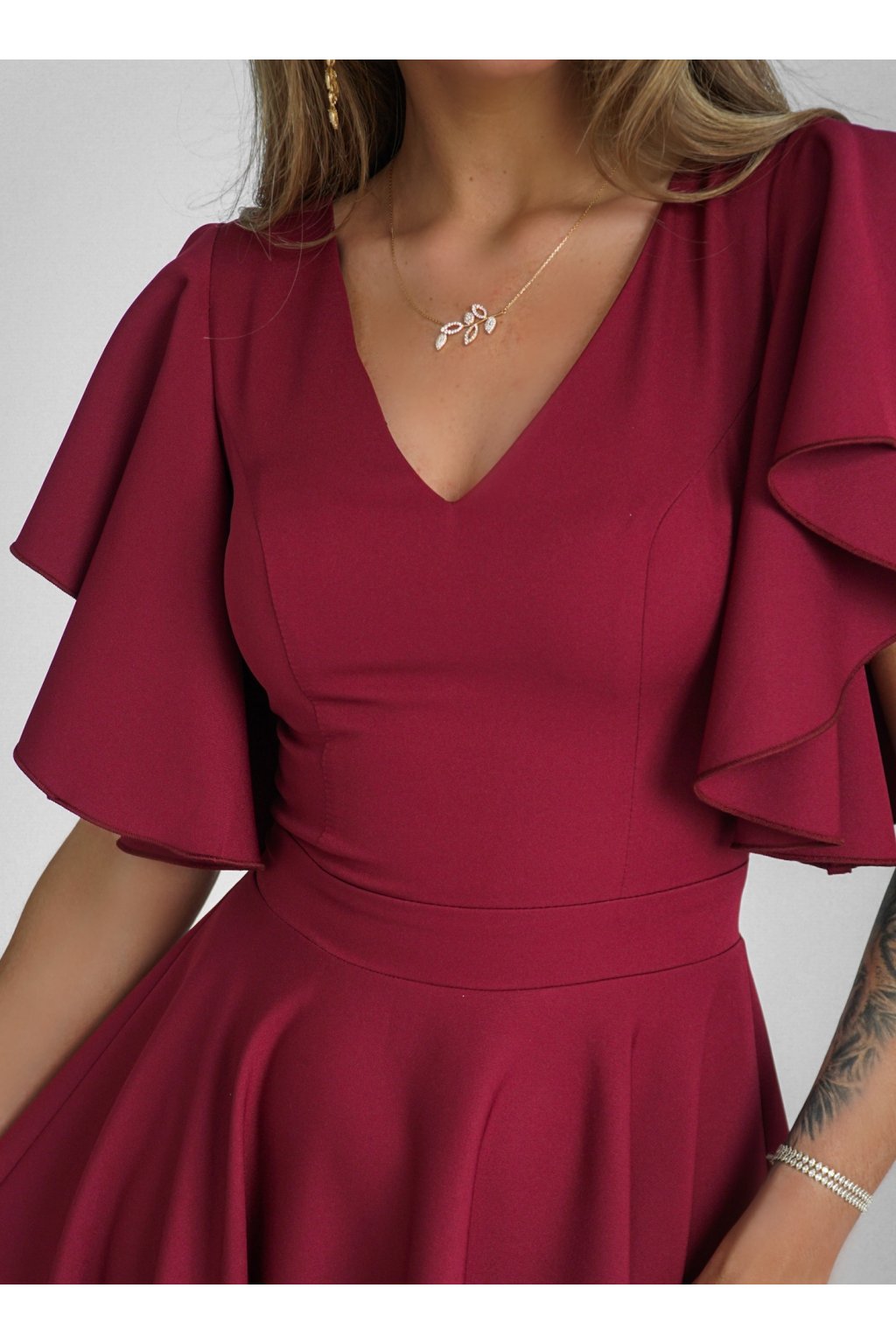 Ebben a ruhában garantáltan mindenki figyelmét felkelti. A gyönyörű A-vonalú szoknya és a romantikus fodros ujjak kombinációja bájos és elegáns megjelenést biztosít. A ruha hátul cipzárral záródik.