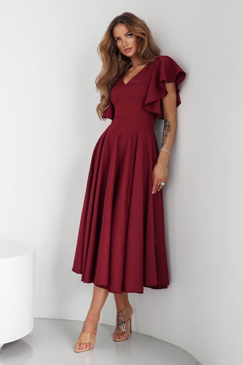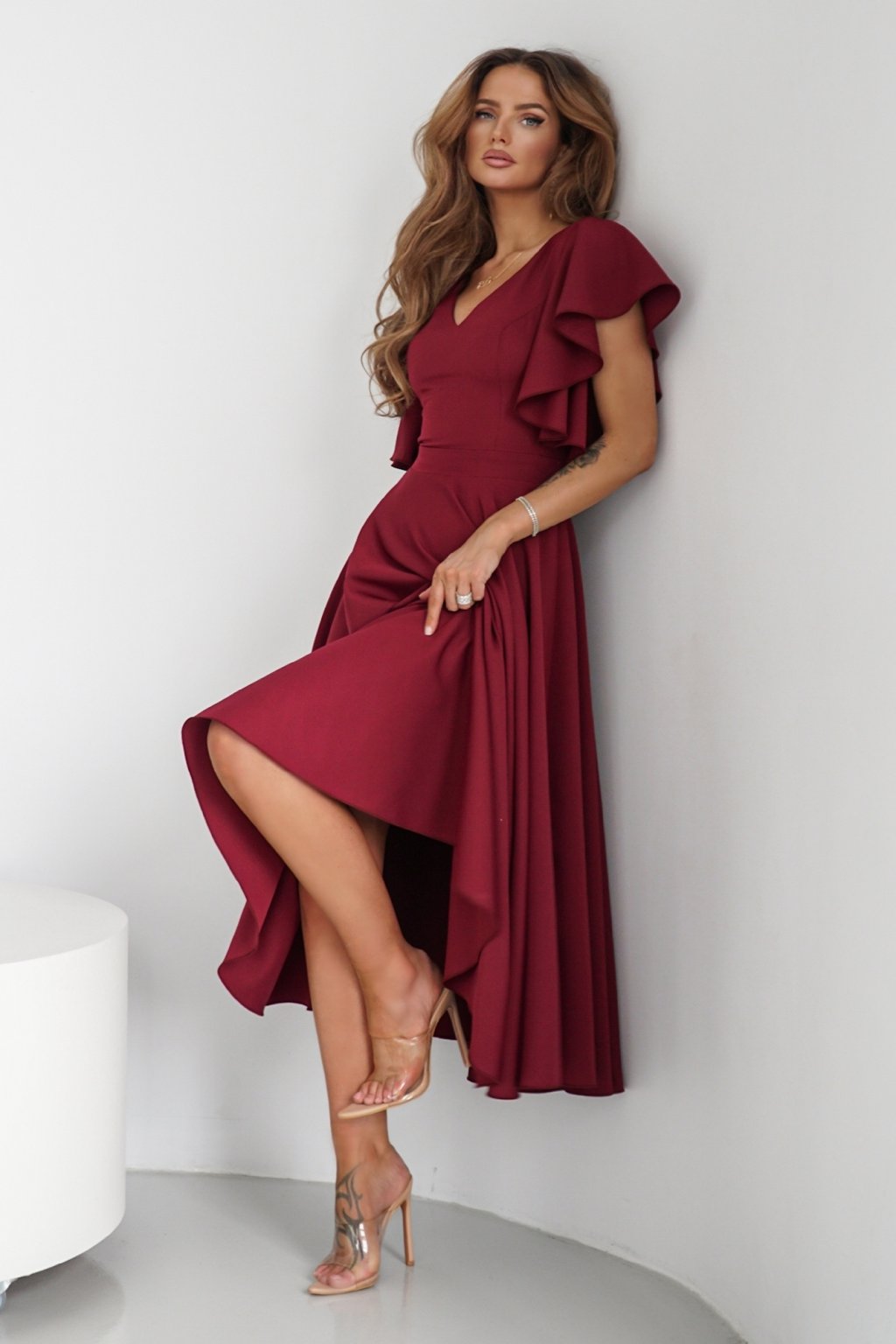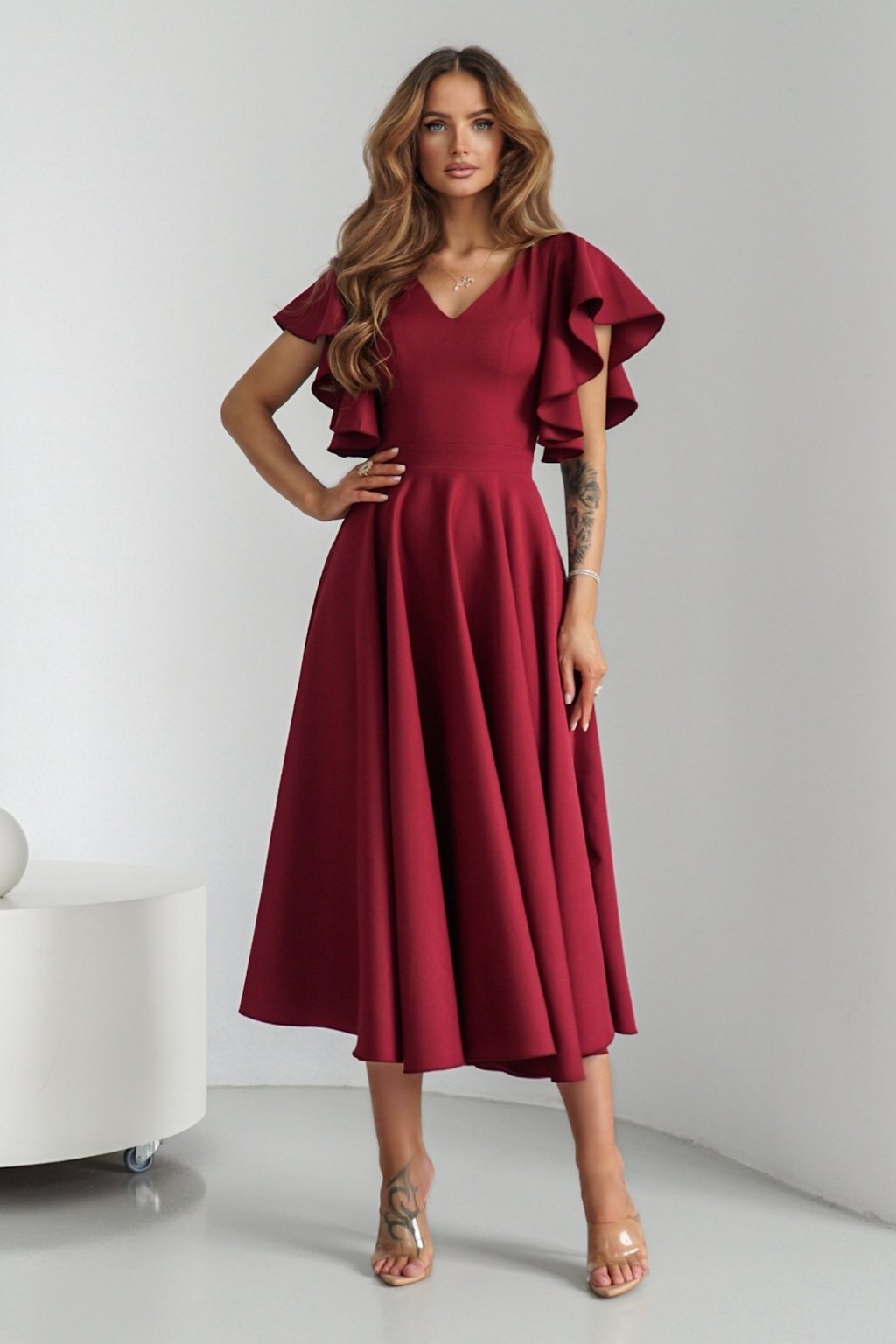 Ebben a ruhában garantáltan mindenki figyelmét felkelti. A gyönyörű A-vonalú szoknya és a romantikus fodros ujjak kombinációja bájos és elegáns megjelenést biztosít. A ruha hátul cipzárral záródik.