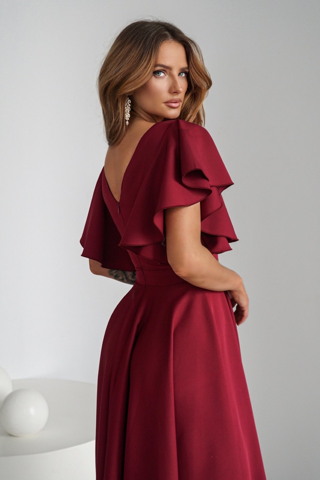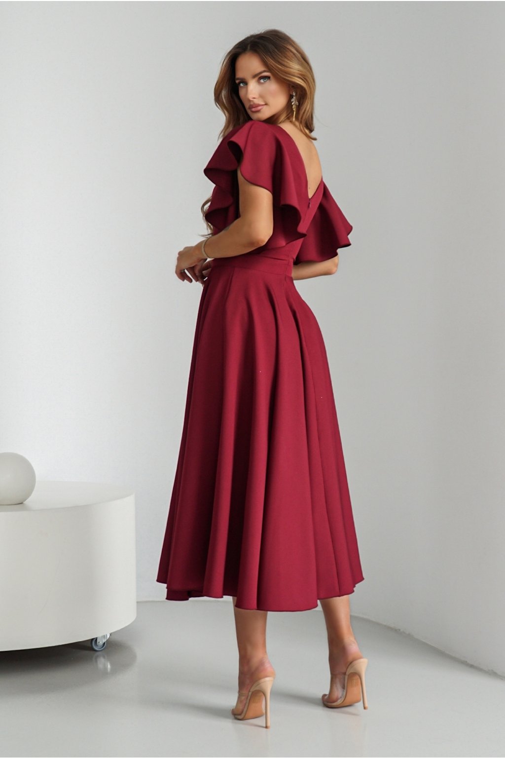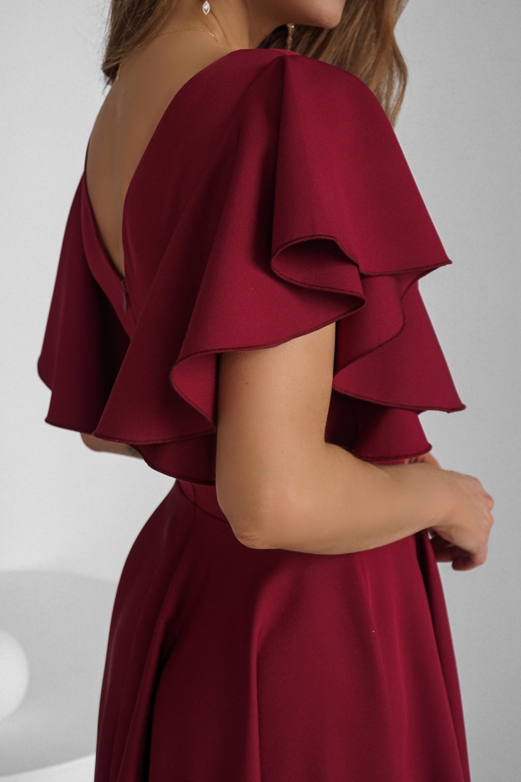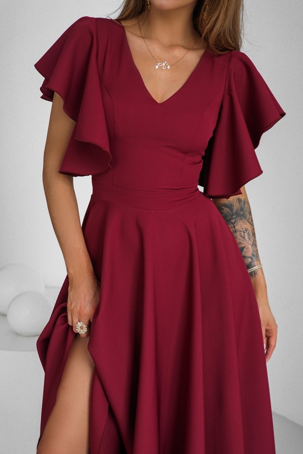 Ebben a ruhában garantáltan mindenki figyelmét felkelti. A gyönyörű A-vonalú szoknya és a romantikus fodros ujjak kombinációja bájos és elegáns megjelenést biztosít. A ruha hátul cipzárral záródik.