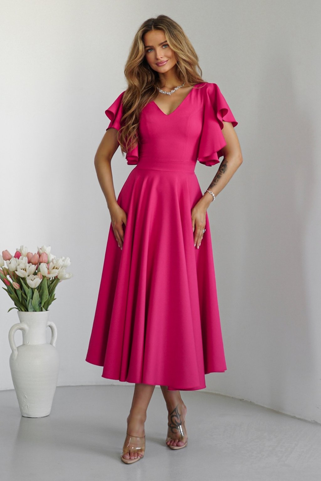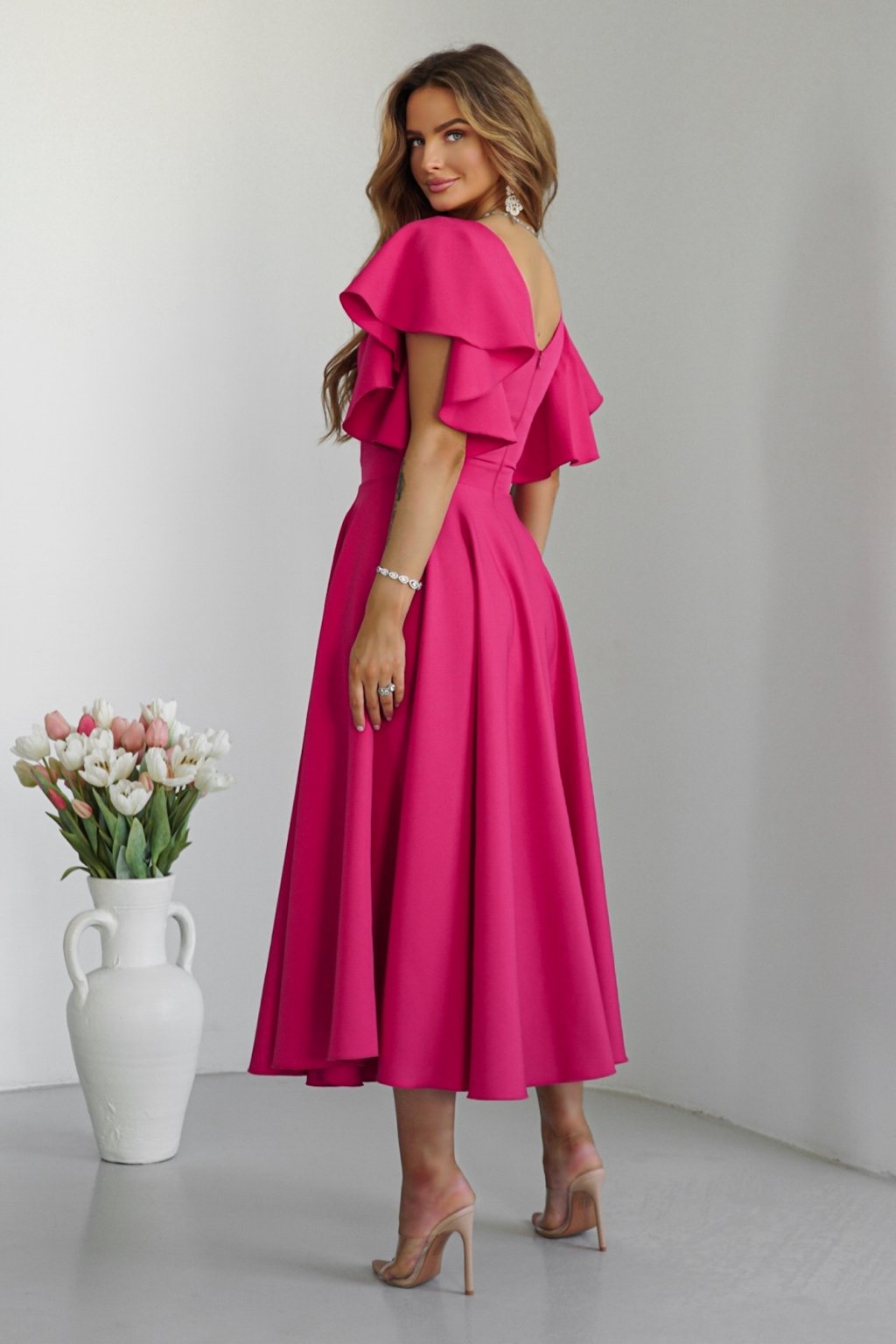 Ebben a ruhában garantáltan mindenki figyelmét felkelti. A gyönyörű A-vonalú szoknya és a romantikus fodros ujjak kombinációja bájos és elegáns megjelenést biztosít. A ruha hátul cipzárral záródik.