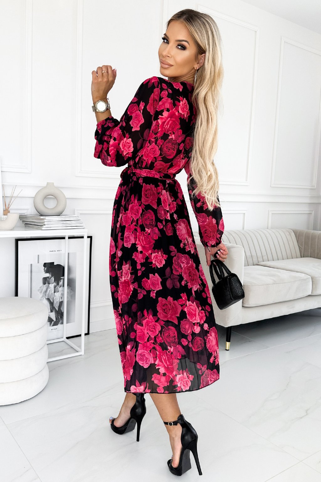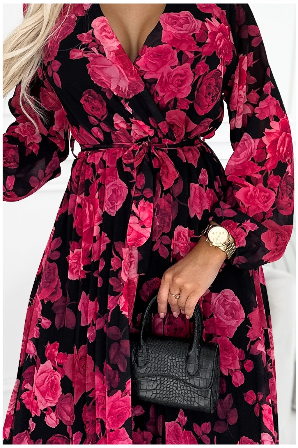 Romantikus, gyengéd, elegáns - ebben a szépséges virágokkal borított ruhában káprázatos hölgy lesz egy romantikus vacsorán. A ruha anyaga könnyű és kellemes, derékban gumis.