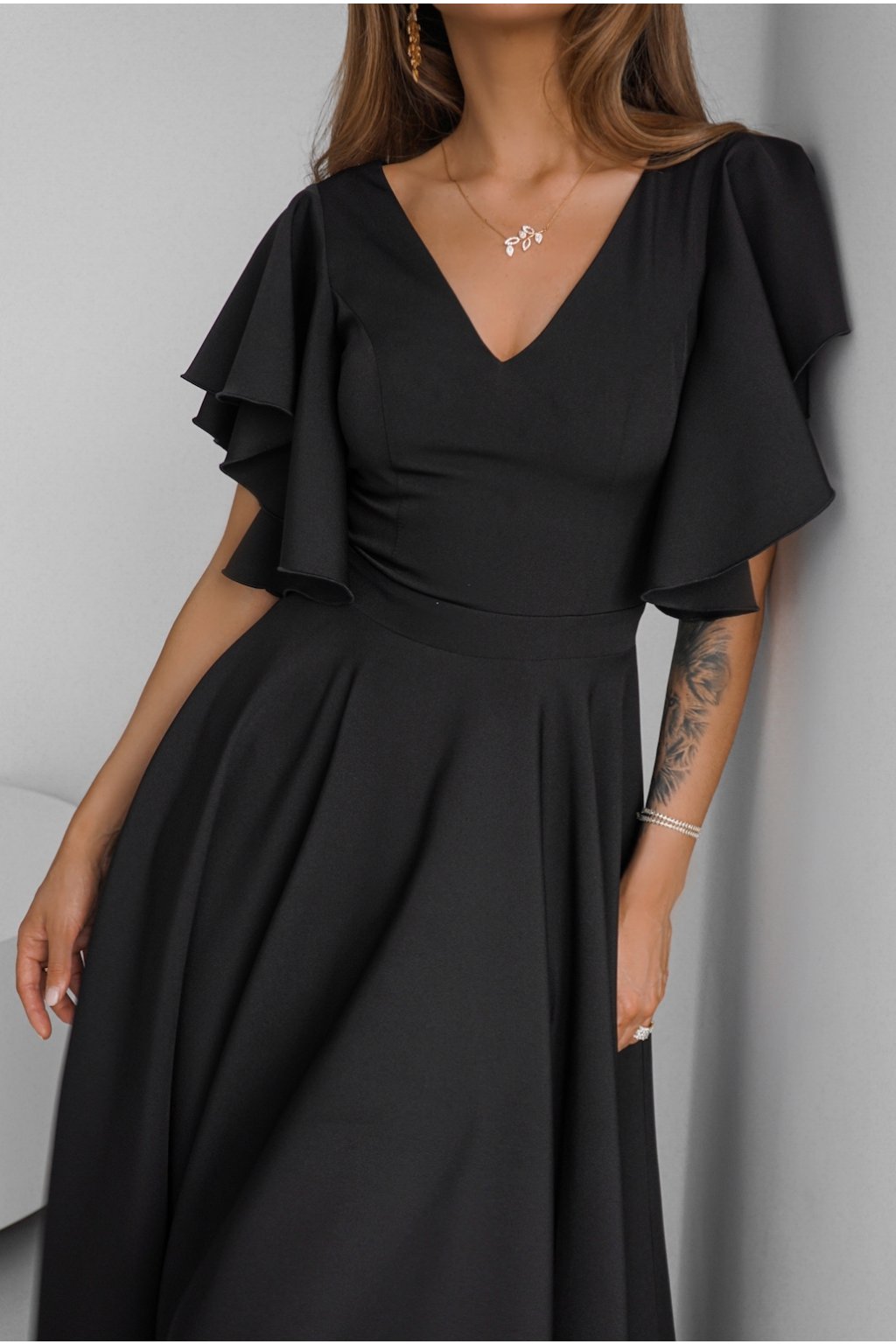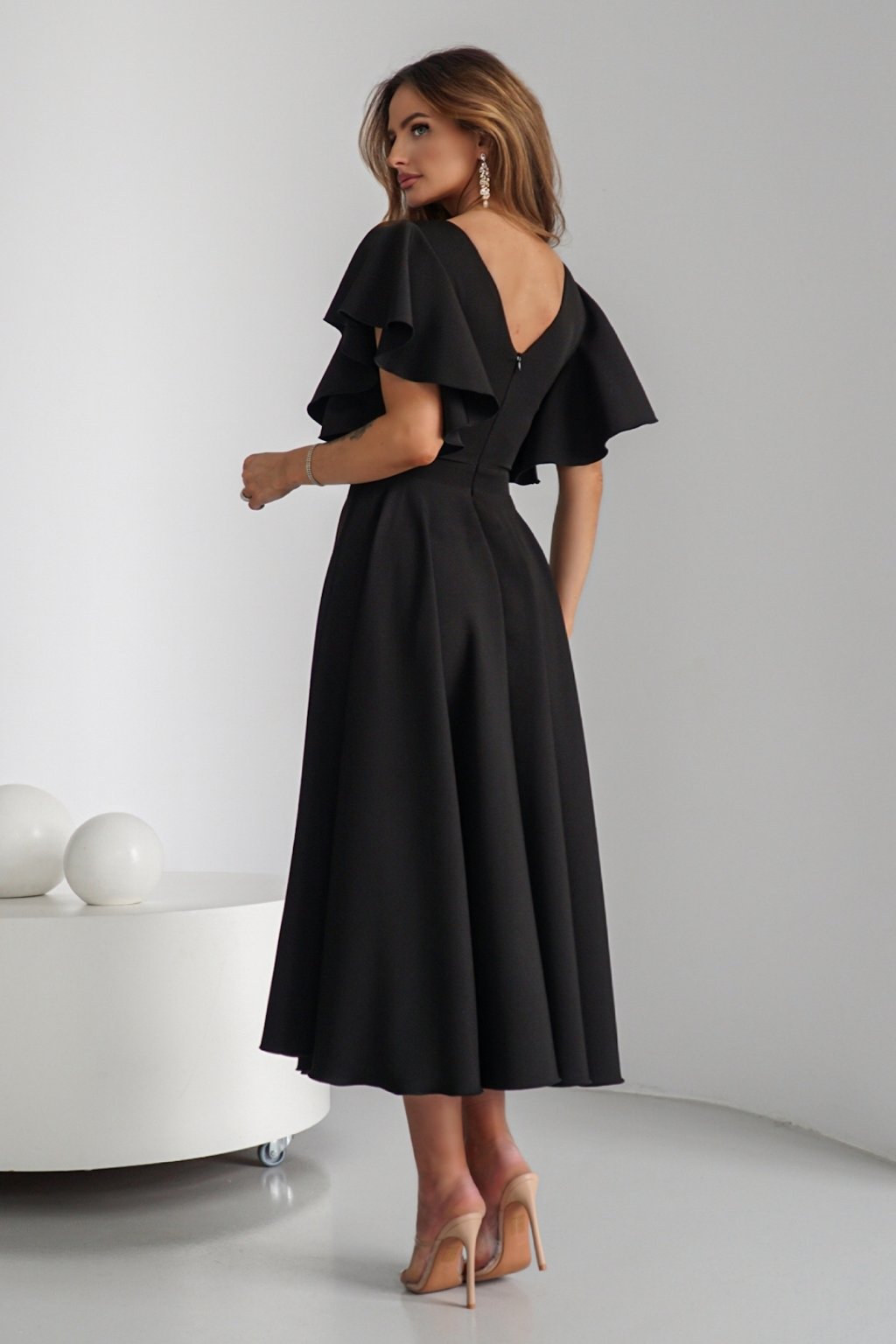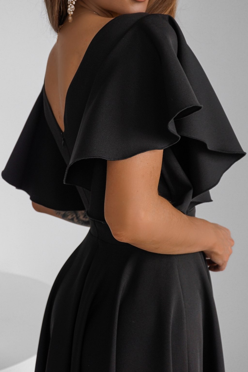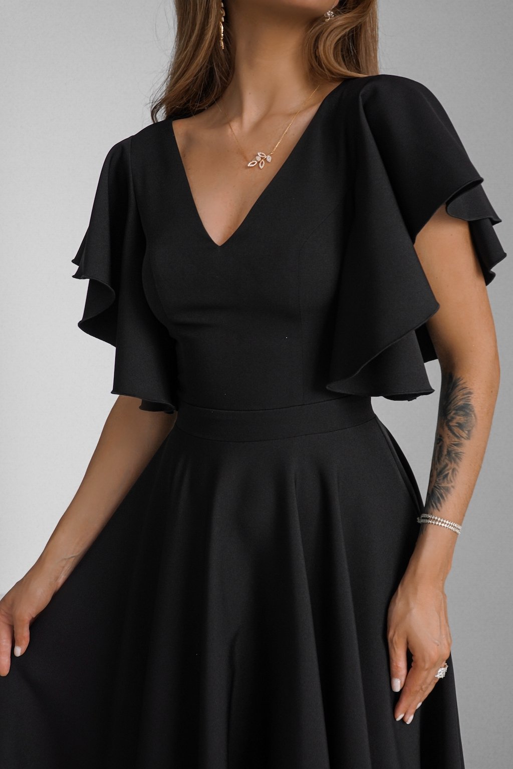 Ebben a ruhában garantáltan mindenki figyelmét felkelti. A gyönyörű A-vonalú szoknya és a romantikus fodros ujjak kombinációja bájos és elegáns megjelenést biztosít. A ruha hátul cipzárral záródik.