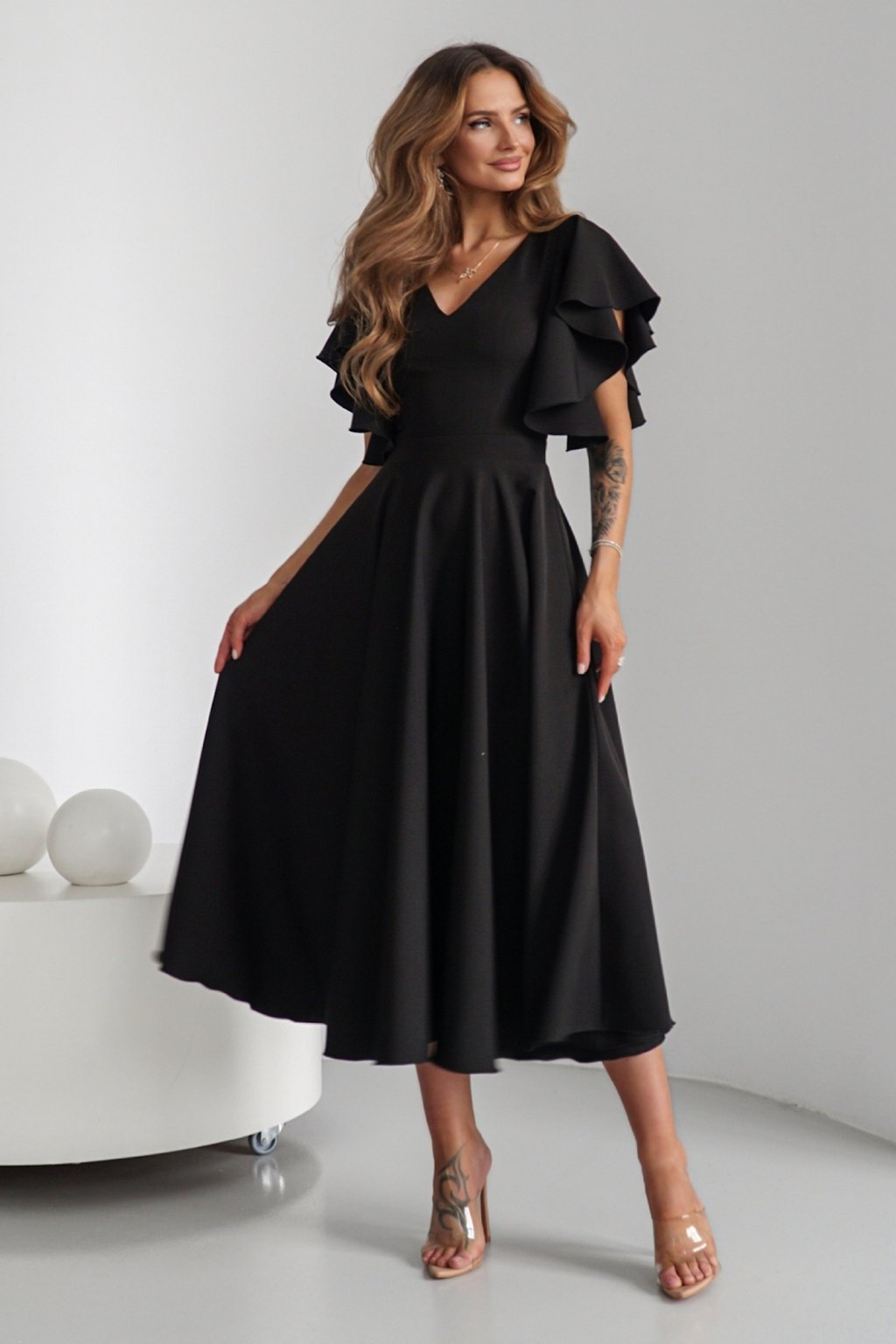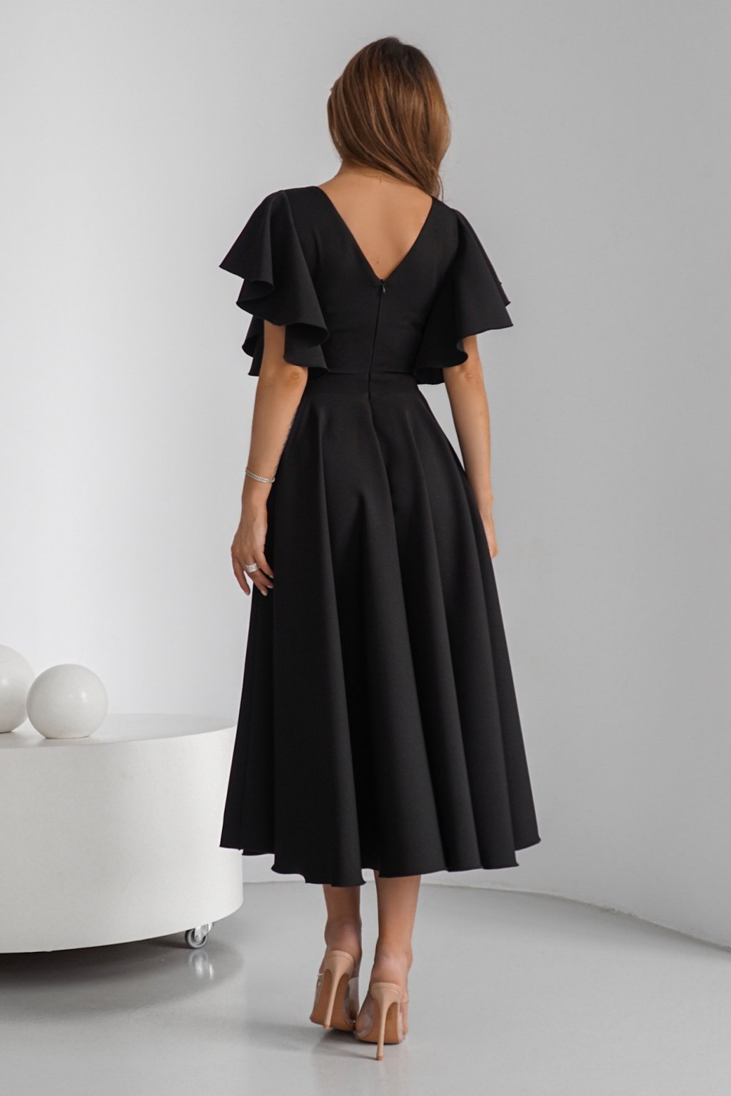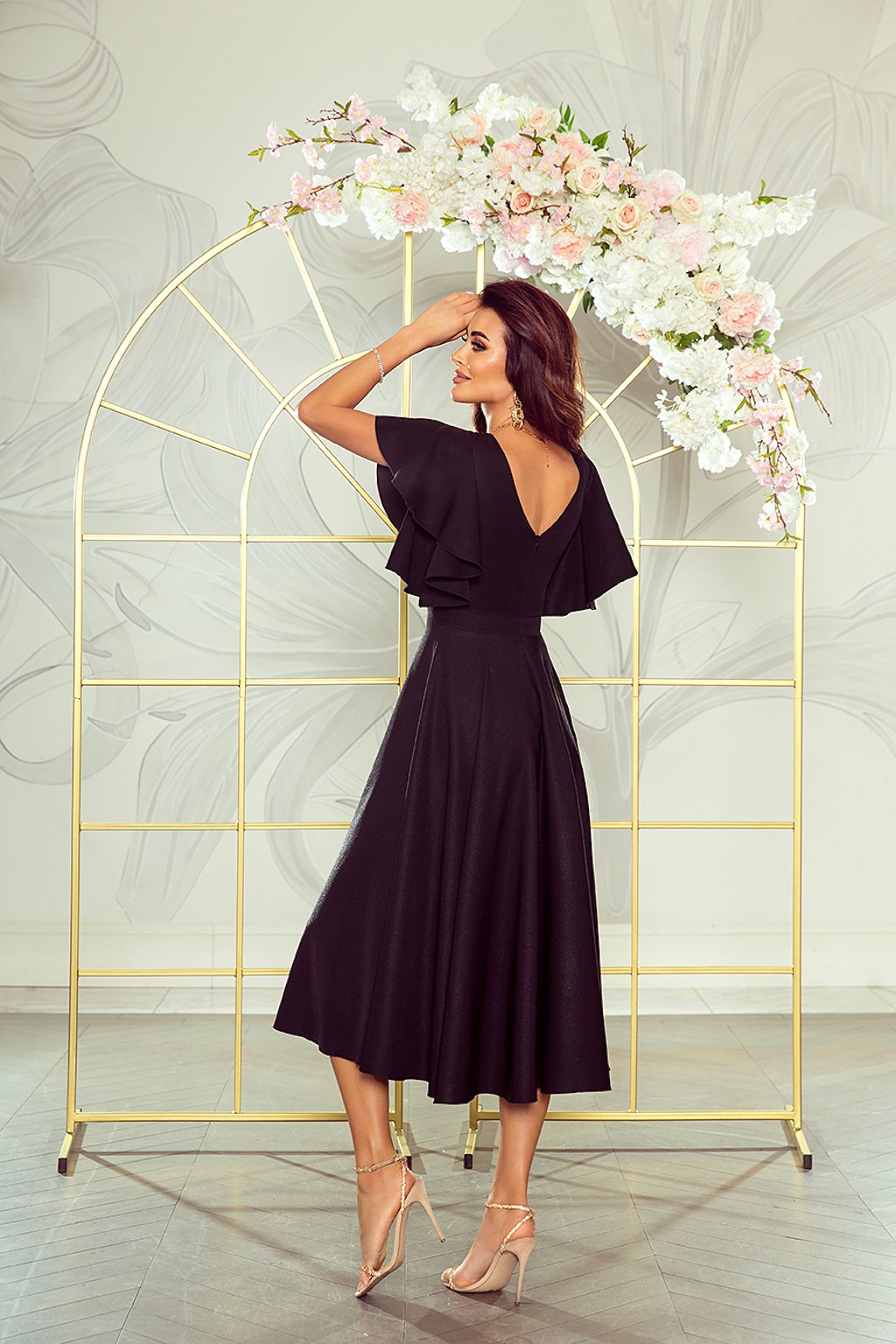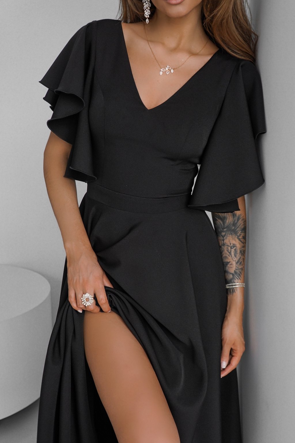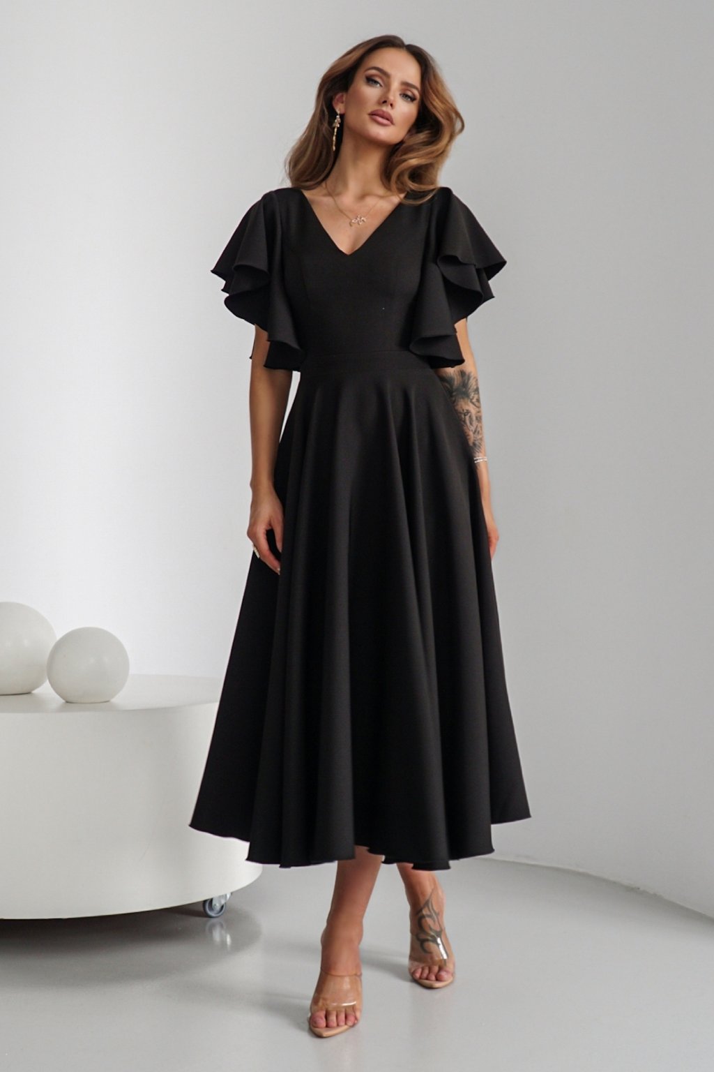 Ebben a ruhában garantáltan mindenki figyelmét felkelti. A gyönyörű A-vonalú szoknya és a romantikus fodros ujjak kombinációja bájos és elegáns megjelenést biztosít. A ruha hátul cipzárral záródik.