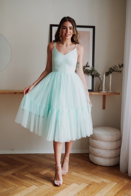 Látványos tüll szoknya, amely vezető helyet foglal el a divat világában - ez a ruha egyszerűen elbűvölő. A pántok állíthatóak, a ruha hátul cipzárral záródik.
