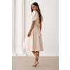 Egy ruha, amely különleges pillanatokhoz van teremtve. Finom szabása az enyhén puffos ujjakkal, és kecses nyakkivágása gyengéd és nőies hatást kelt. Az egyenletesen szélesedő szoknya gyönyörűen hullámzik mozgás közben, könnyedséget és eleganciát kölcsönözve a teljes ruhának. Ideális választás romantikus találkozókra, esküvőre vagy olyan pillanatokhoz, amikor hercegnőnek szeretnéd érezni magad. Hátul cipzárral záródik.