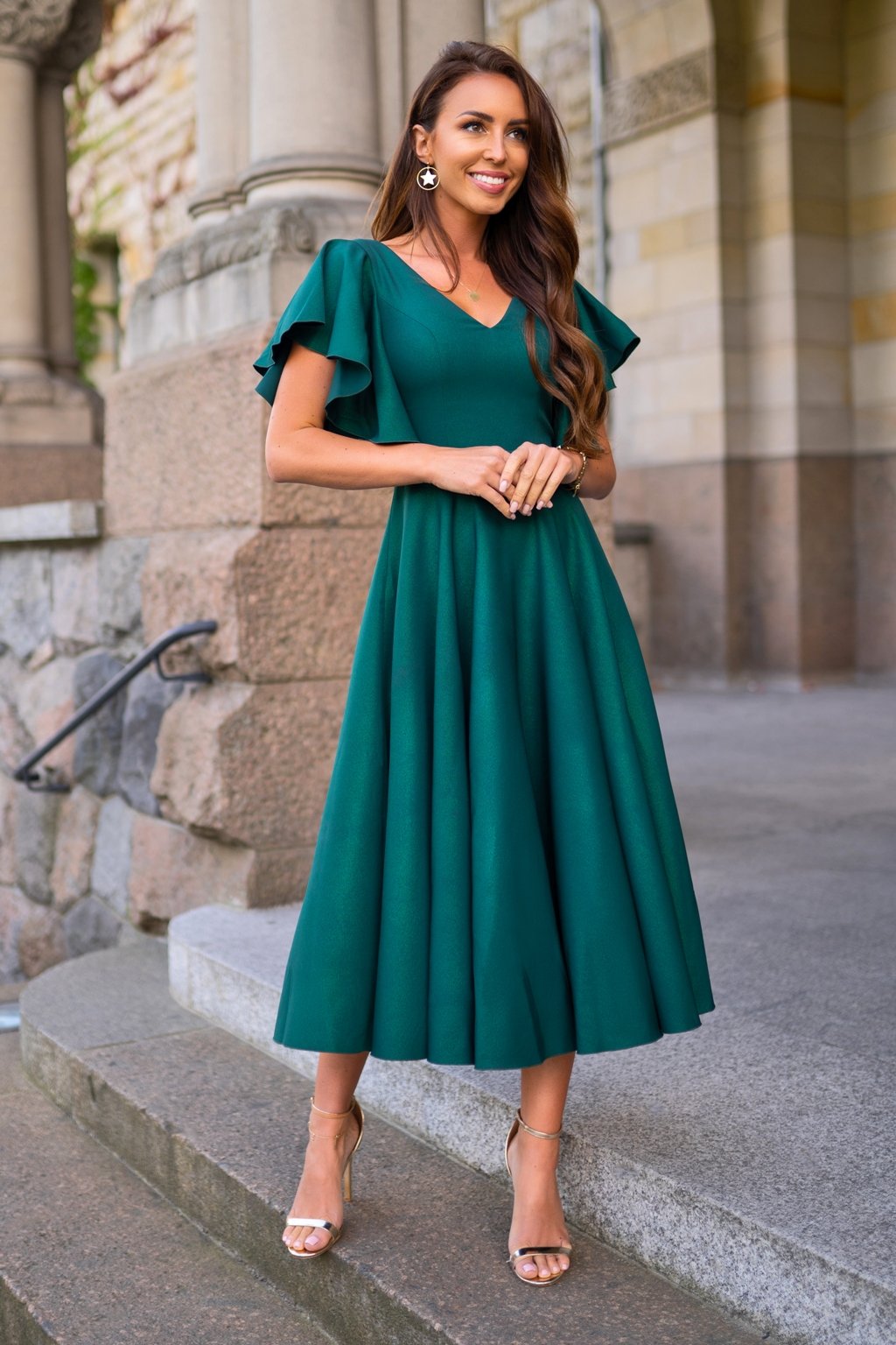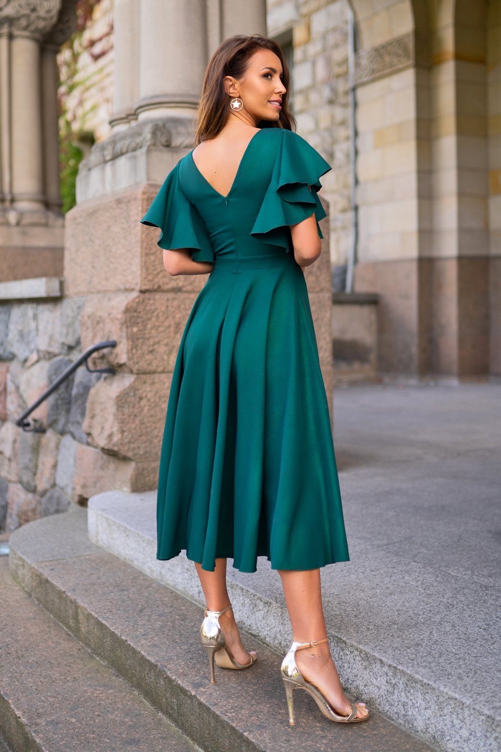 Ebben a ruhában garantáltan mindenki figyelmét felkelti. A gyönyörű A-vonalú szoknya és a romantikus fodros ujjak kombinációja bájos és elegáns megjelenést biztosít. A ruha hátul cipzárral záródik.