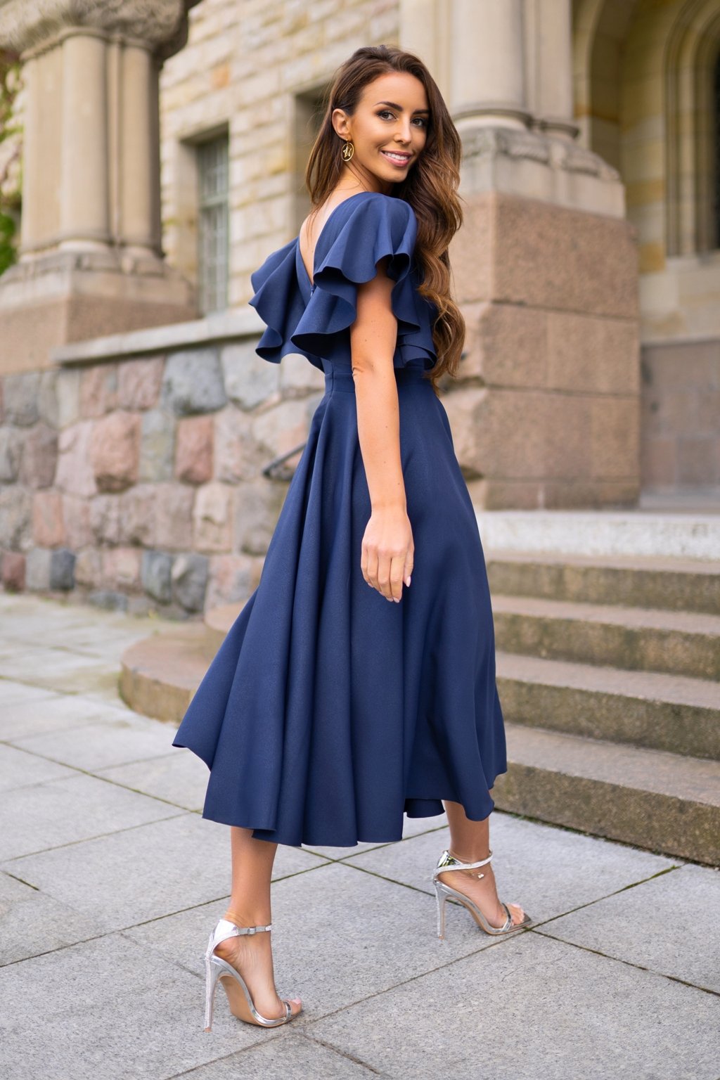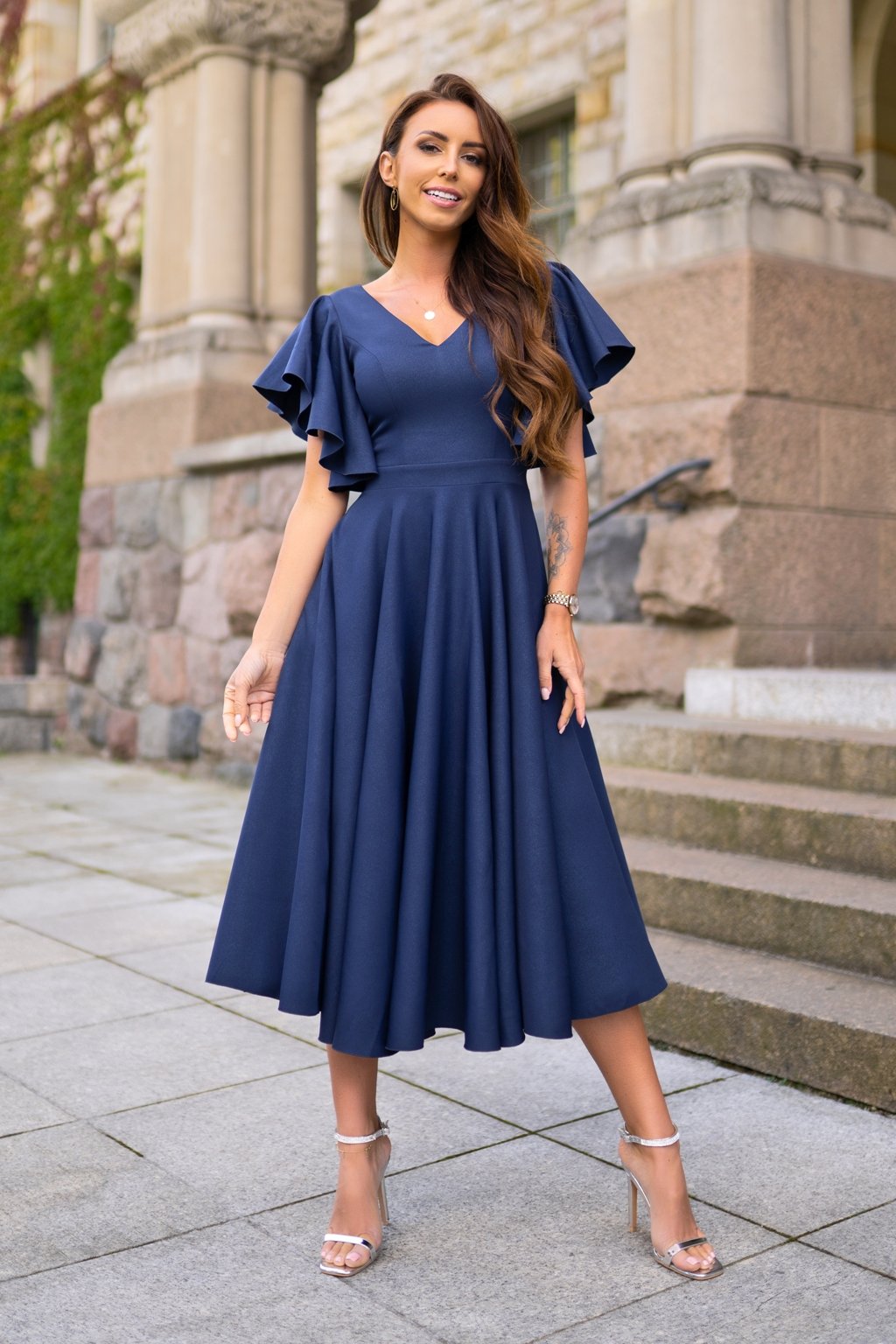 Sötétkék midi ruha fodros ujjakkal
