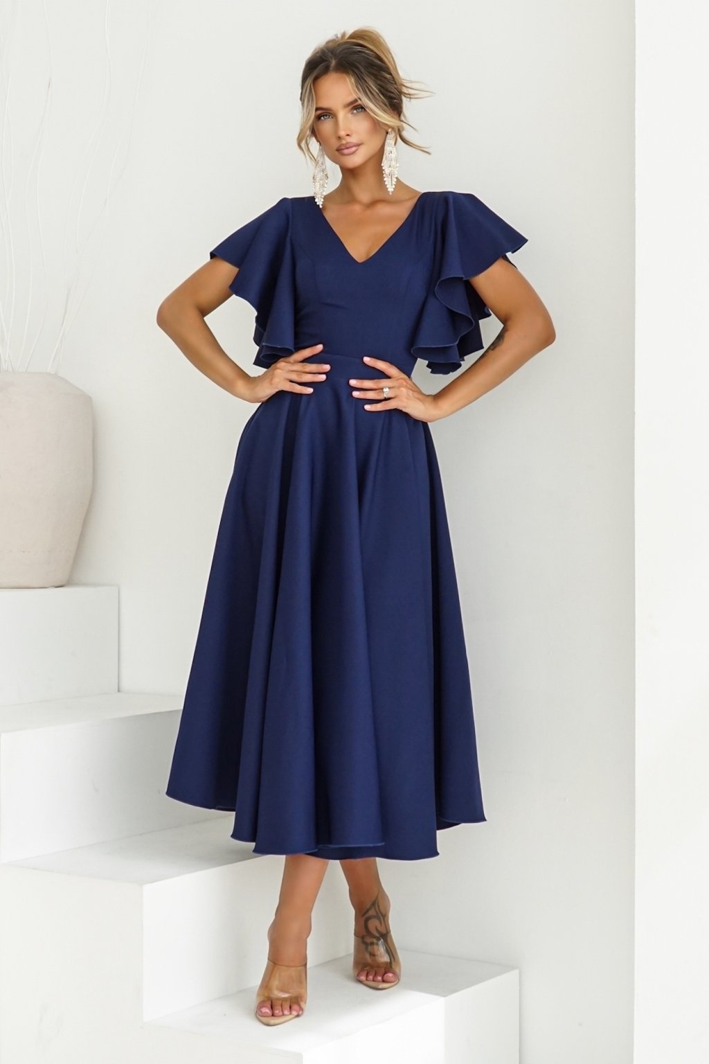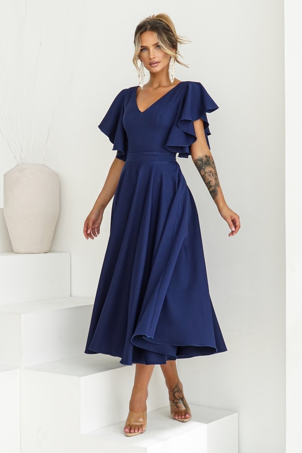 Ebben a ruhában garantáltan mindenki figyelmét felkelti. A gyönyörű A-vonalú szoknya és a romantikus fodros ujjak kombinációja bájos és elegáns megjelenést biztosít. A ruha hátul cipzárral záródik.