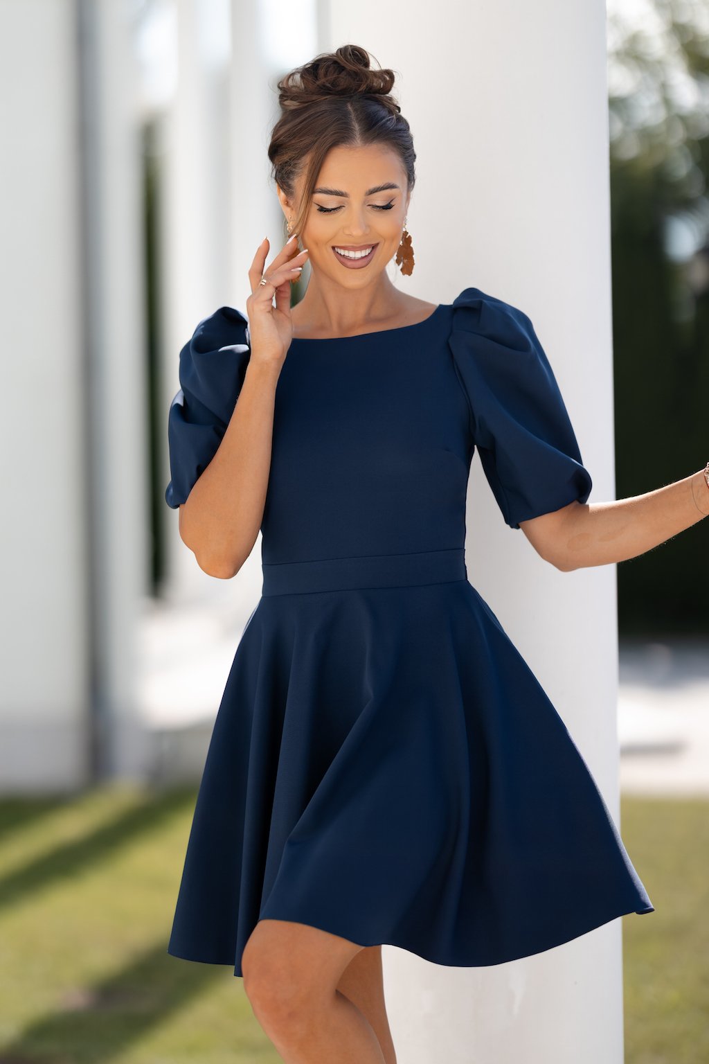 Ez a bájos ruha a nőiesség és a finom elegancia megtestesítője. A rövid fazon fiatalosan és üdén hat, miközben az A-vonalú szoknya gyönyörűen kiemeli a sziluettet, és minden lépésnél könnyedséget kölcsönöz a megjelenésnek. A laza rövid ujjak romantikus és gyengéd hangulatot biztosítanak, ennek köszönhetően ideális választás különleges pillanatokhoz. A ruha hátul cipzárral záródik.
