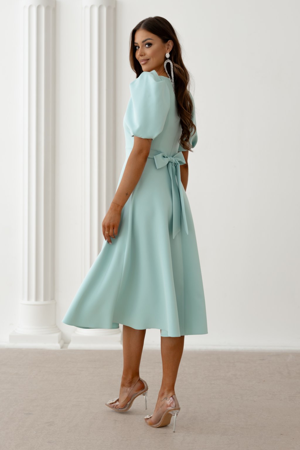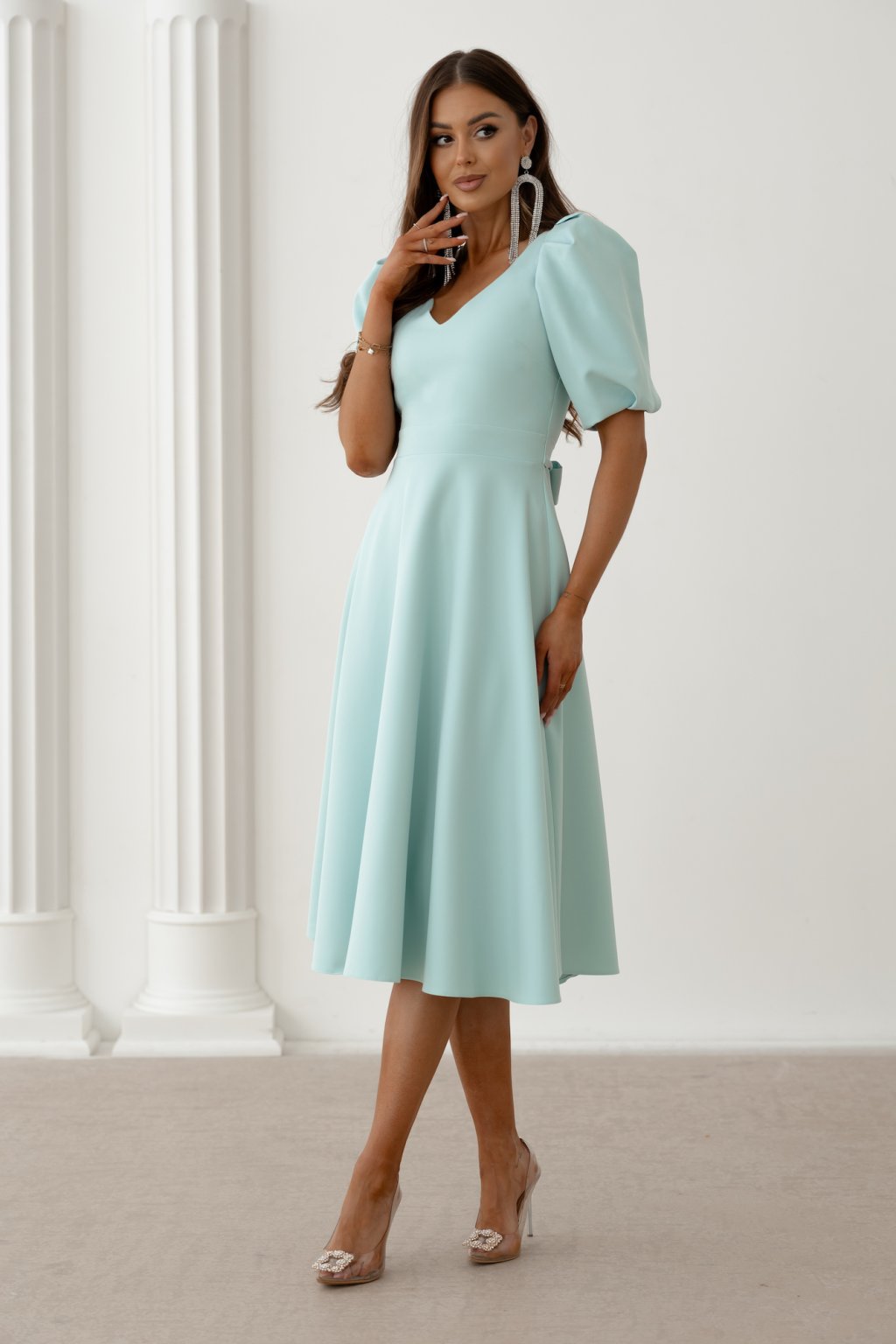 Egy ruha, amely különleges pillanatokhoz van teremtve. Finom szabása az enyhén puffos ujjakkal, és kecses nyakkivágása gyengéd és nőies hatást kelt. Az egyenletesen szélesedő szoknya gyönyörűen hullámzik mozgás közben, könnyedséget és eleganciát kölcsönözve a teljes ruhának. Ideális választás romantikus találkozókra, esküvőre vagy olyan pillanatokhoz, amikor hercegnőnek szeretnéd érezni magad. Hátul cipzárral záródik.